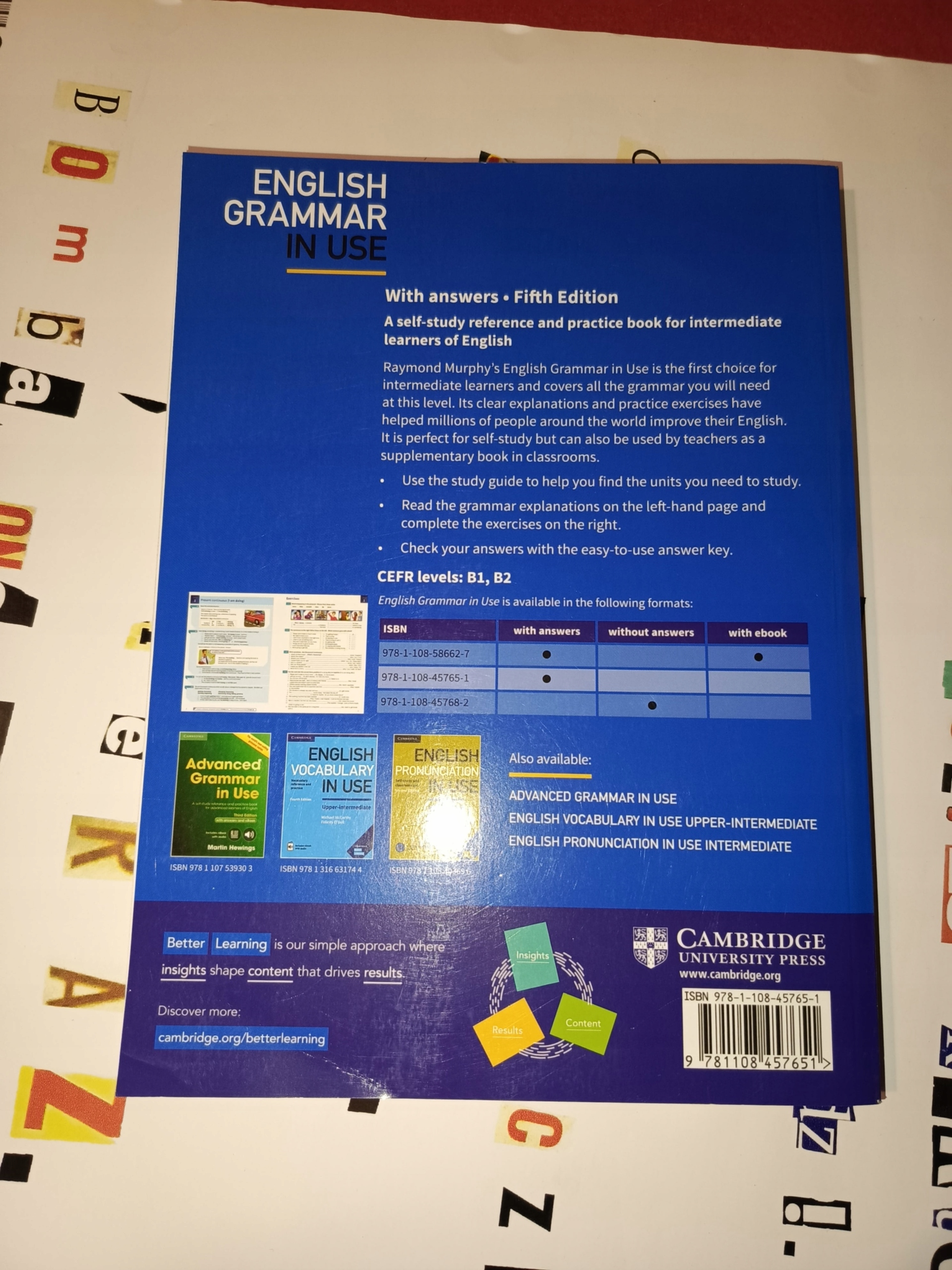 Мерфі Реймонд Кембриджський університетський прес Реймонд Мерфі, англійська граматика, яка використовується,-це перший вибір для проміжних (B1-B2) учнів і охоплює всю граматику, яка вам знадобиться в цьому рівень. Ця книга з відповідями має чіткі пояснення та практичні вправи, які мільйони людей у всьому світі покращують свою англійську мову. Він ідеально підходить для самостійного навчання, а також може використовуватись викладачами як додаткову книгу в класах.