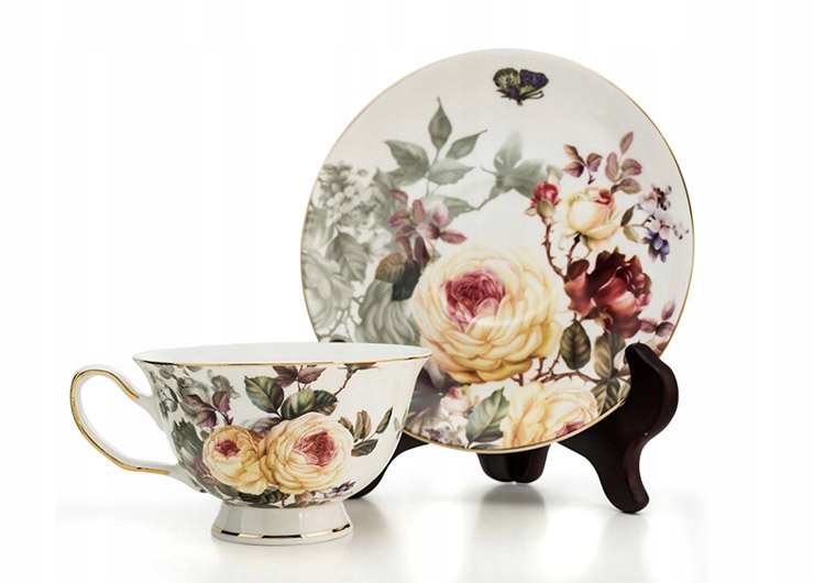 - Кольори: простий білий фон. Троянди в жовто-кремових і темно-червоних відтінках, інші рослинні елементи в зелених, сірих і коричневих тонах. Всередині чашка біла із золотою смугою всередині. Золоті прикраси також знайдені на краях чашки, ручці та блюдця.