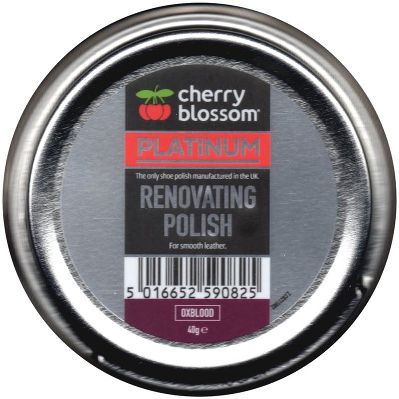 Ремонтний крем для взуття від Cherry Blossom Platinum бордового кольору (oxblood). Виробляється в Англії з 1906 року. На основі натурального жиру, ланоліну та карнаубського пальмового воску. Має в рази більше вмісту барвника та карнаубського воску, тому не тільки доглядає за шкірою, але й ефективно маскує недоліки (подряпини, потертості). Очищає, живить і оновлює шкіру. Після його використання взуття знову набуде ідеального вигляду та насиченого кольору. Упаковка: 40 г.