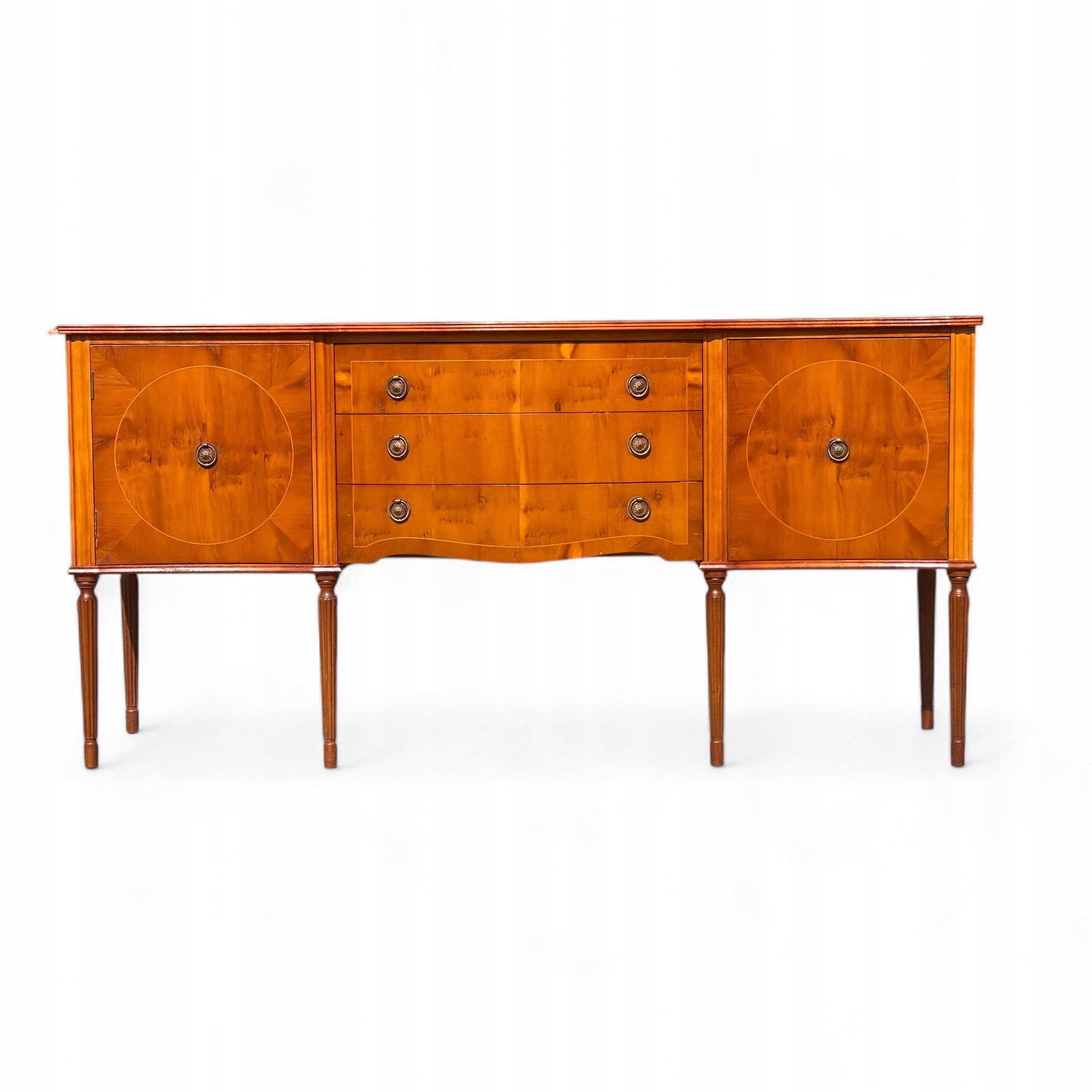 Комод має профільовані арочні фасади ящиків і бічні дверцята, прикрашені тонкими вставками.