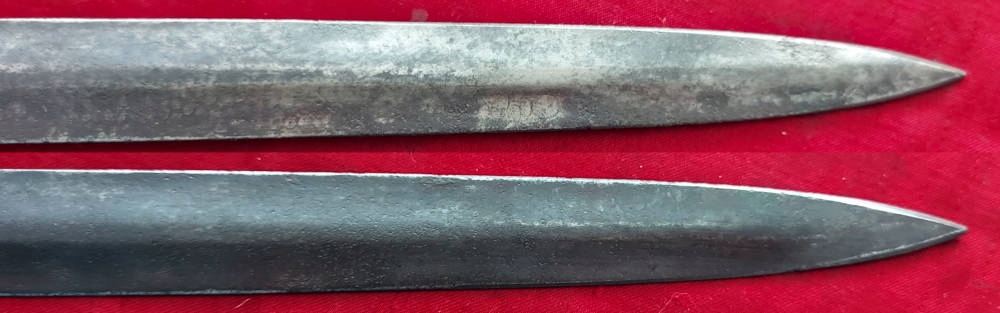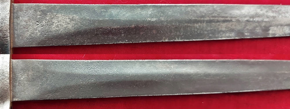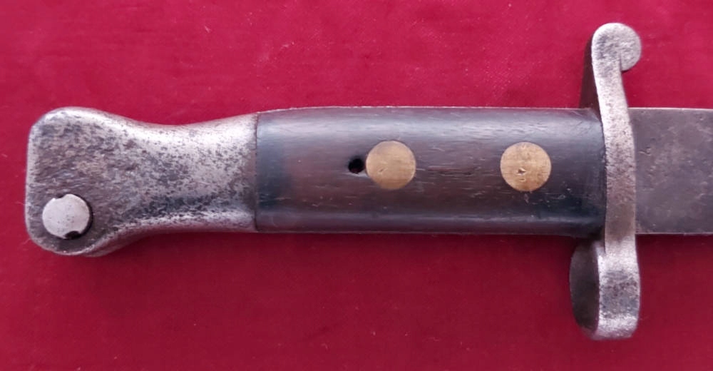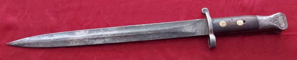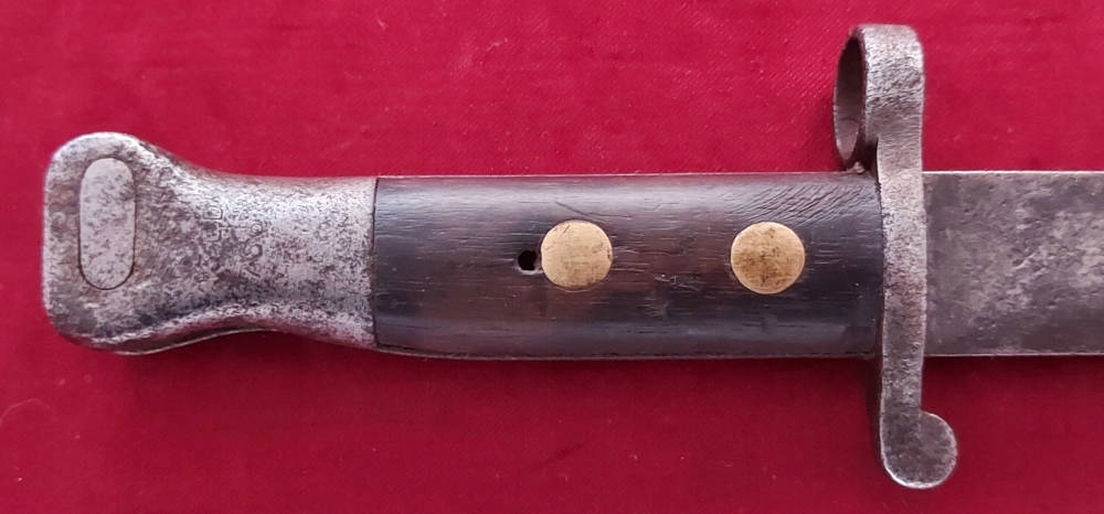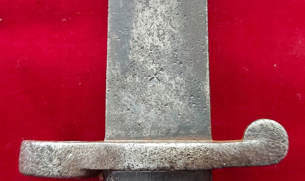 Копія, яку видно на фото. Лезо нешліфоване, покрите темним нальотом, місцями з дрібним зерном. На кромці леза є слабкі сліди. серед інших WD (Військове відомство). З іншого боку7 04(вироблений липень 1904 р.). Накладки на ручки оригінальні, дерев'яні. Багнетний замок справний. Також є позначки на голові, трохи розмиті, ймовірно, 23 LD 786.