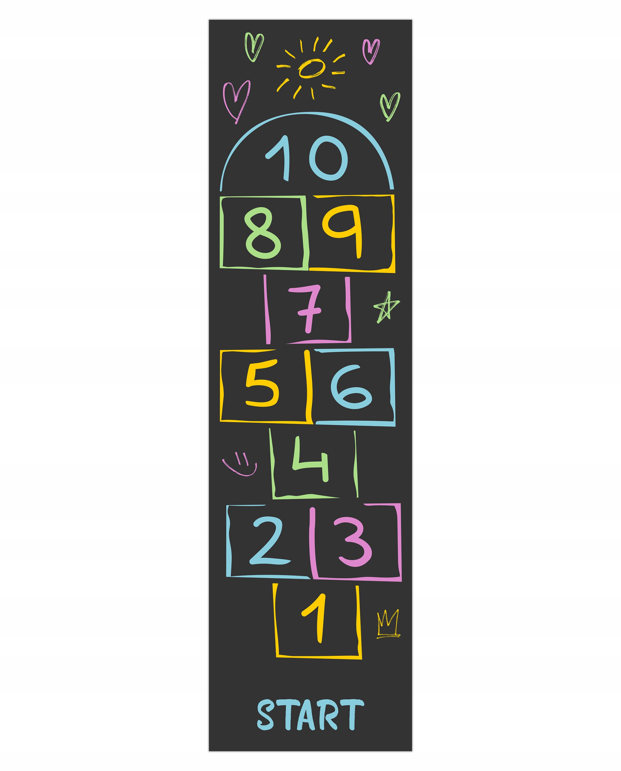 наш килимок для спаровування в стилі шкільної дошки - це унікальне поєднання класичної забави з сучасним дизайном. Барвисті числа, малюнки та крейдовий ефект змушують дітей із задоволенням приймати виклик стрибків за числами - як у класі, так і в коридорі чи ігровому майданчику.