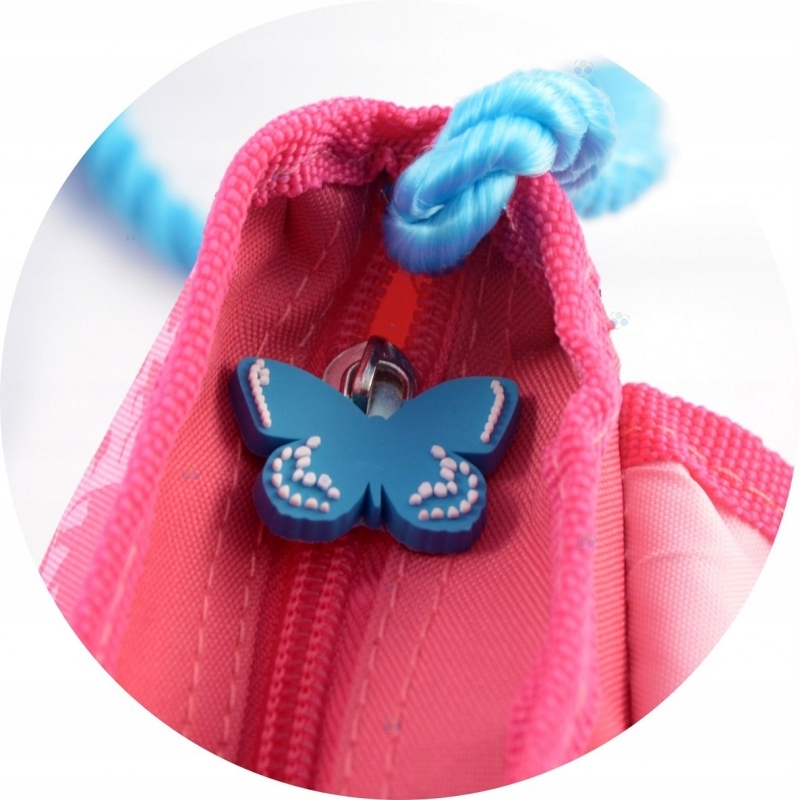 Сумка рожева, з блакитними елементами: ремінець і бант спереду.