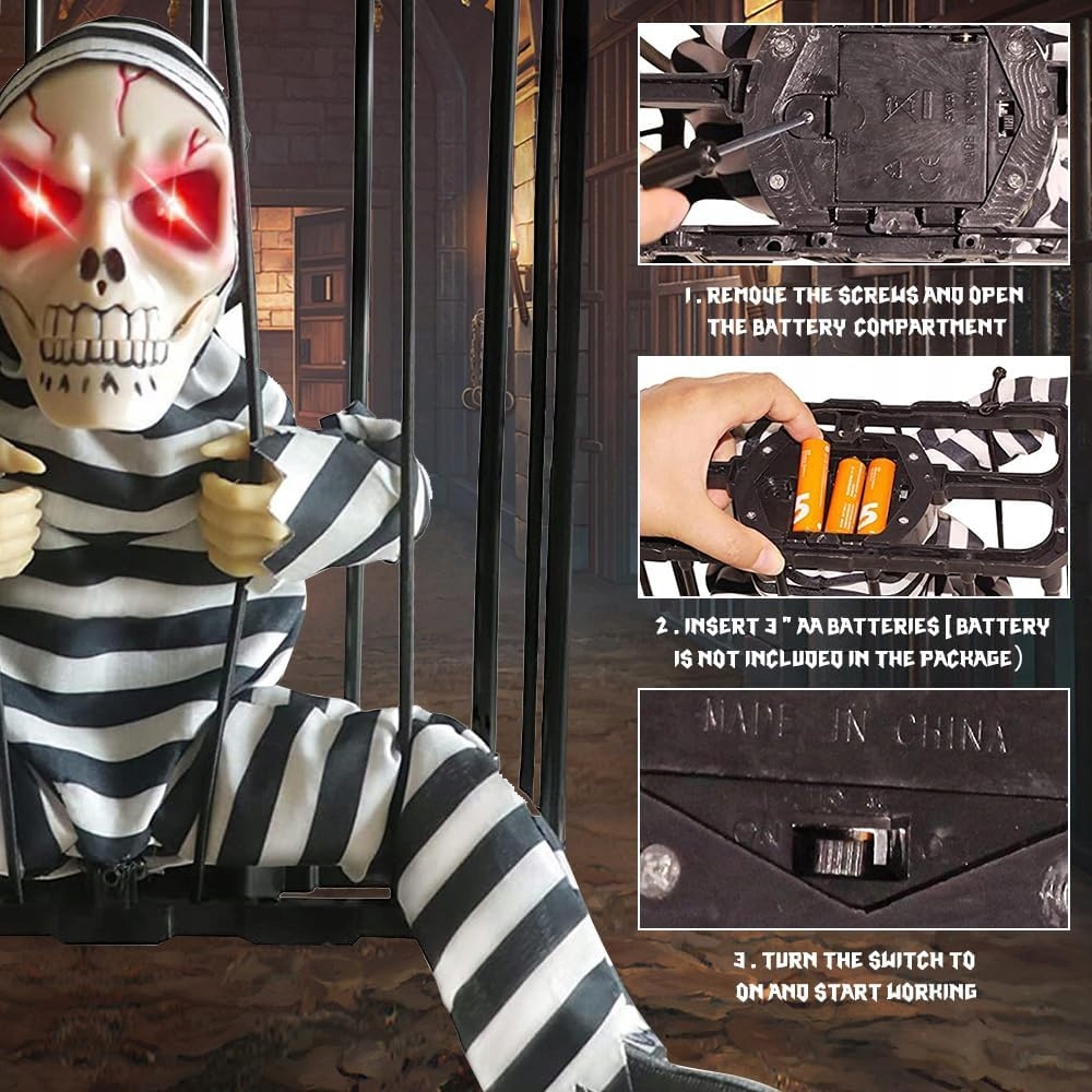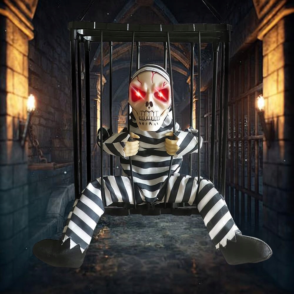 Ця підвісна прикраса представляє захоплений скелет, який реагує на рух і світло. Оснащений червоними, сяючими очима і гучним криком, це може налякати кожного перехожого.