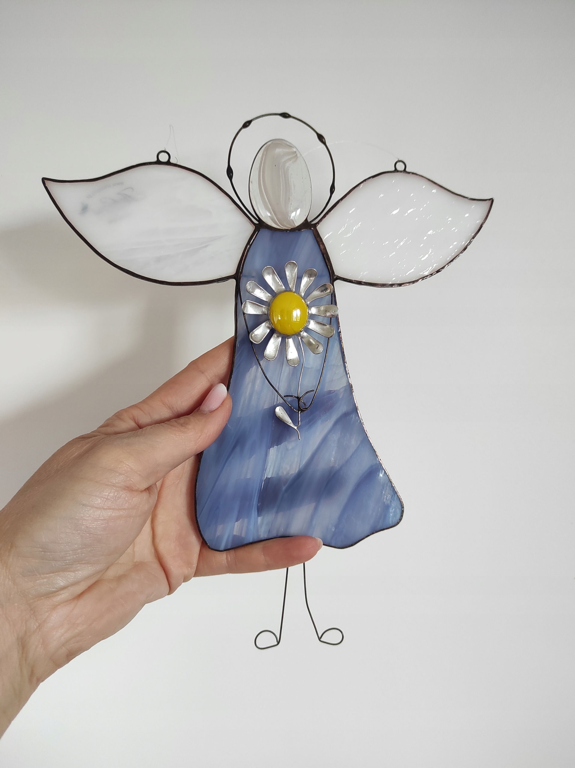 Anioł duży ze Stokrotką Wiszący aniołek witrażowy Anioł z sercem