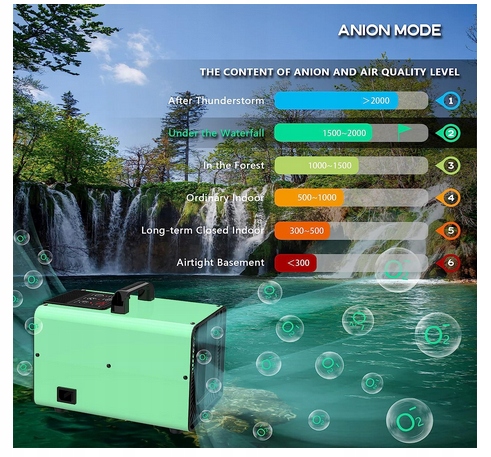 Ексклюзивний аніонний режим – освіжувач повітря – На основі очищення повітря ми також додаємо аніонний модуль для освіження повітря. Негативні іони можуть нейтралізувати пилок, туман, пил та інші повітряні частинки з позитивним зарядом і змушувати їх природним чином осідати в повітрі. Використання аніонного режиму після очищення озоном дозволяє значно освіжити повітря в кімнаті, ніби воно знаходиться під водоспадом.