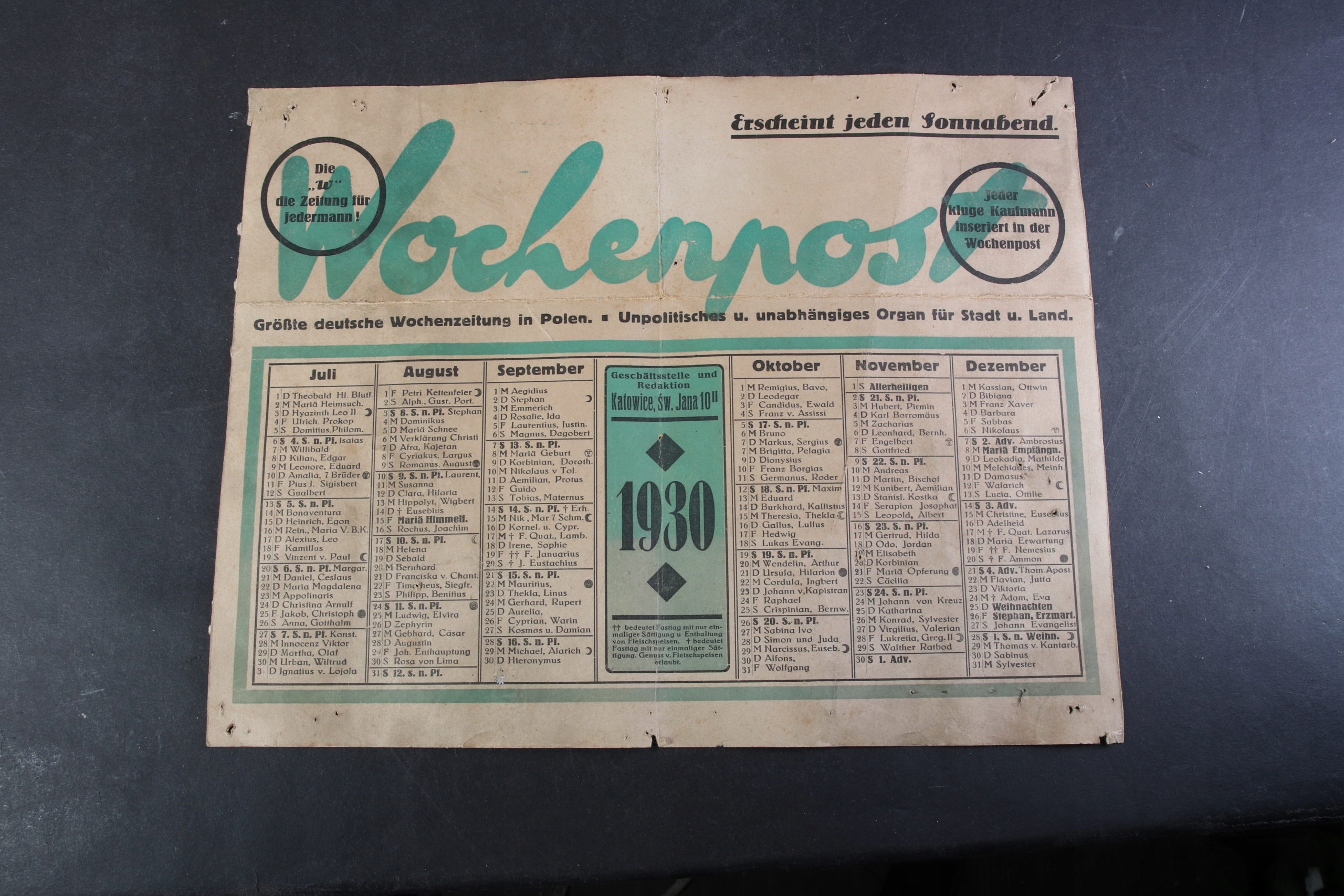 Ank II RP календар для німецької меншини Katowice 1930 Рідкісний!