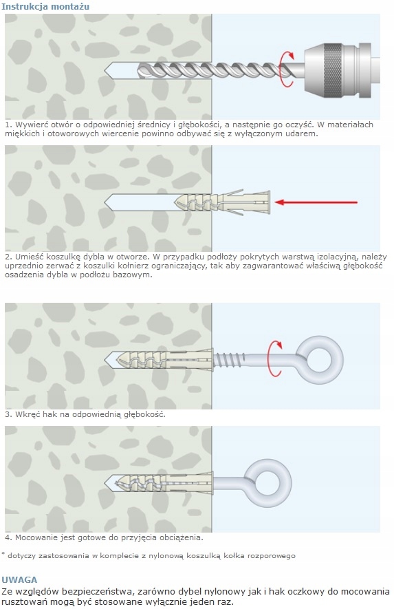 після використання нейлонового розширювального дюбеля, для монтажу в бетон класу B25 або вище, природний камінь і повнотіла цегла.