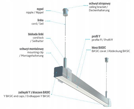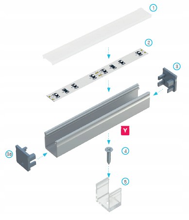 Схема монтажу елементів системи освітлення з використанням Y-профілю та (1) абажура BASIC, (2) світлодіодної стрічки, (3) ковпачка без отвору, (3а) ковпачка з отвором, (4) гвинта, (4) (5) Y монтажний кронштейн