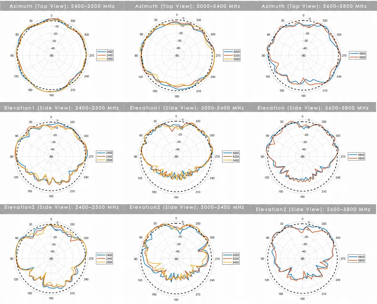 7 дБі — це пікове посилення в усіх діапазонах від 2400–2500 і 5000–6000 МГц.