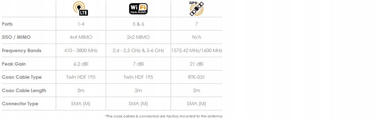 MIMO-3-17 — це високоефективна багаточастотна антена 7-в-1, яка забезпечує чотири стільникові мережі, дві Wi-Fi та антену GPS/ГЛОНАСС. Чотири стільникові антени MIMO (для 2G/3G/4G) охоплюють сучасні діапазони від 690 МГц до 2700 МГц, а також новий спектр LTE і 5G для діапазонів CBRS 450 МГц і 3,5 ГГц, який стає популярним у різних міжнародних мережах телефонів LTE. Надширокосмугова продуктивність антени дозволяє використовувати її в різних операторах і технологіях, і вона готова до майбутнього для стільникових технологій до 3,8 ГГц для додатків 5G. Антена також забезпечує дві окремі дводіапазонні антени Wi-Fi, забезпечуючи одночасну роботу на частотах 2,4 ГГц і 5 ГГц на кожній антені з можливістю 2x2 MIMO. Сьома антена — це високопродуктивна активна система GPS/ГЛОНАСС, яка працює при температурі до -40 ° C. MIMO-3-17 перевершує більшість конкурентів завдяки увазі до дизайну цієї високопродуктивної антени. Діаграми спрямованості всіх випромінювальних елементів забезпечують відмінний баланс між всеспрямованістю, різноманітністю діаграм і хорошими можливостями випромінювання на потрібній висоті. Це важливий критерій для транспортного та морського ринку. для яких антена була спеціально розроблена. Основні додатки включають комерційні/промислові транспортні засоби, судноплавство, M2M та інші системи Інтернету речей, які використовують широкий спектр радіотехнологій, зберігаючи перспективну функціональність у широкому діапазоні частот.