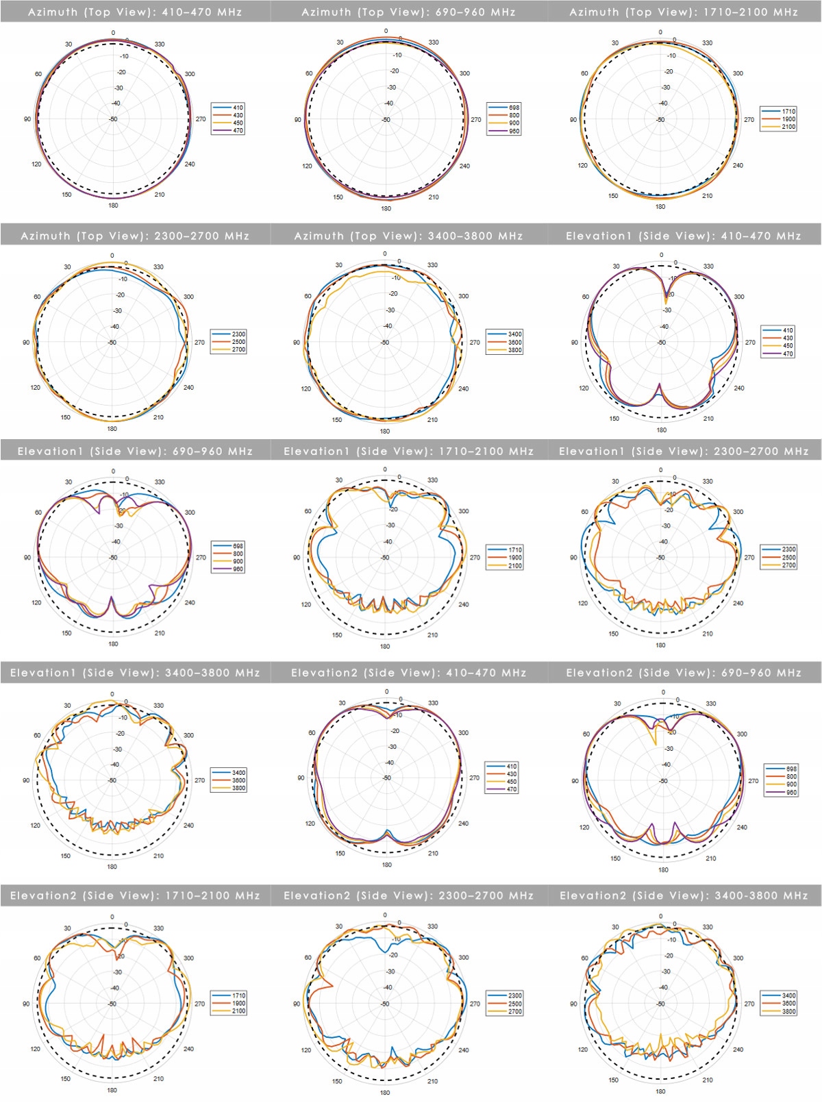 5,8 дБі — це пікове посилення в усіх діапазонах від 410 до 3800 МГц,