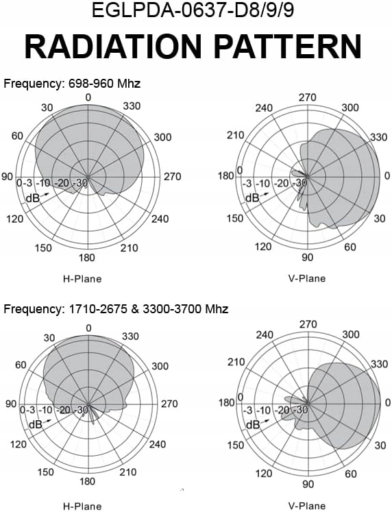 - Діапазон спрямованості цієї антени та коефіцієнт посилення 698–960 МГц (868 МГц) / 8,5 дБі; 1710-2675 МГц/9 дБі; 3300-3700 МГц/9 дБі.