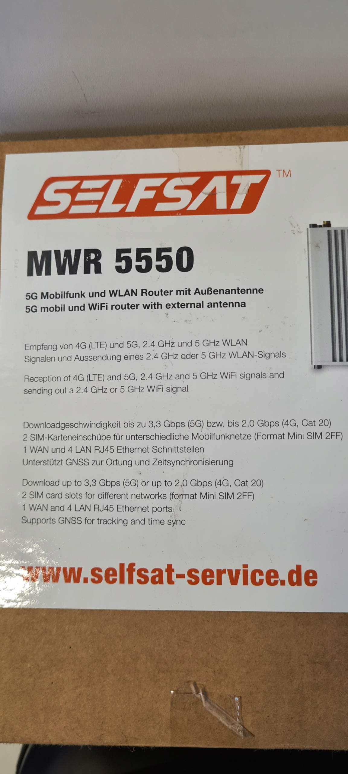 SELFSAT MWR 5550 — це вдосконалений Інтернет-маршрутизатор із підтримкою 4G , стандарти LTE, 5G і WLAN, що забезпечує максимальну швидкість передачі даних до 3,3 Гбіт/с. Цей пристрій ідеально підходить для домашніх користувачів, офісів і малого бізнесу. яким потрібне швидке та стабільне підключення до Інтернету. У комплект також входить антена, яка дозволяє оптимально приймати сигнал в різних географічних умовах.