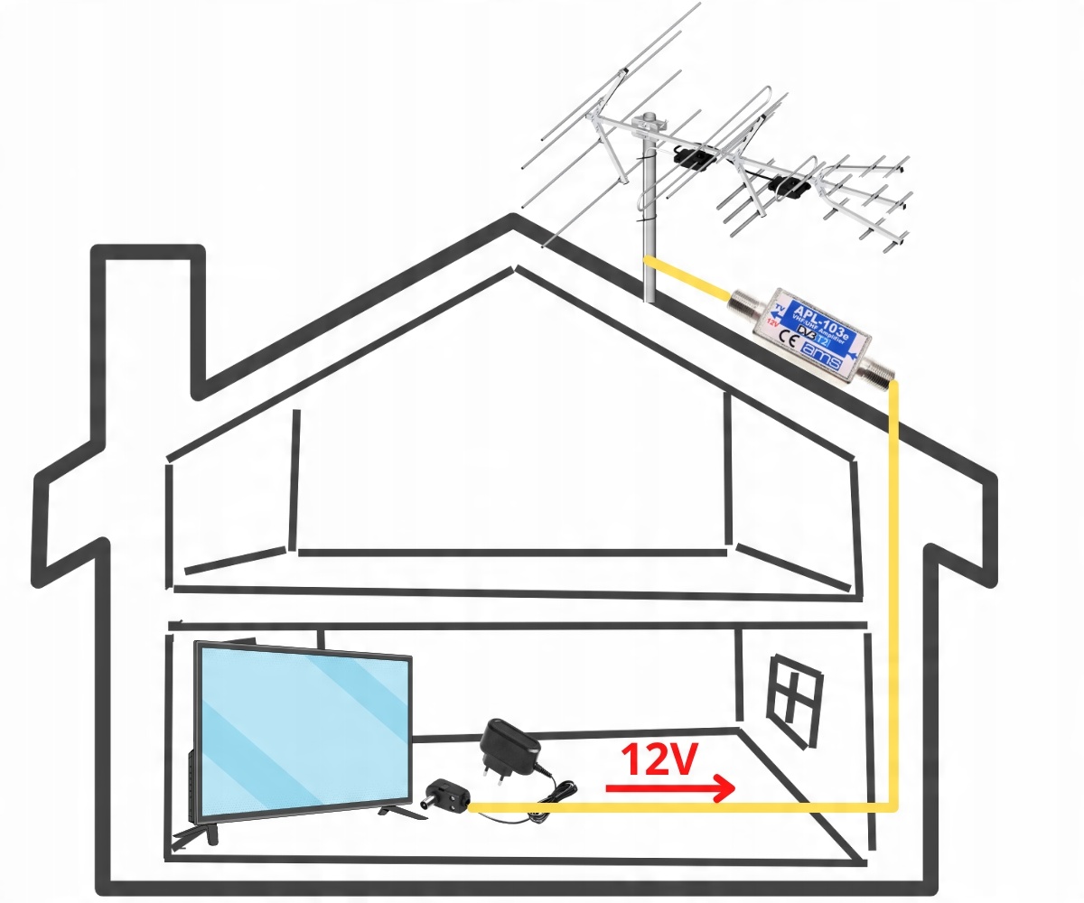 Підсилювач APL-103e призначений для посилення слабких сигналів DAB+ і DVB-T2. Живиться від 12 В постійного струму.