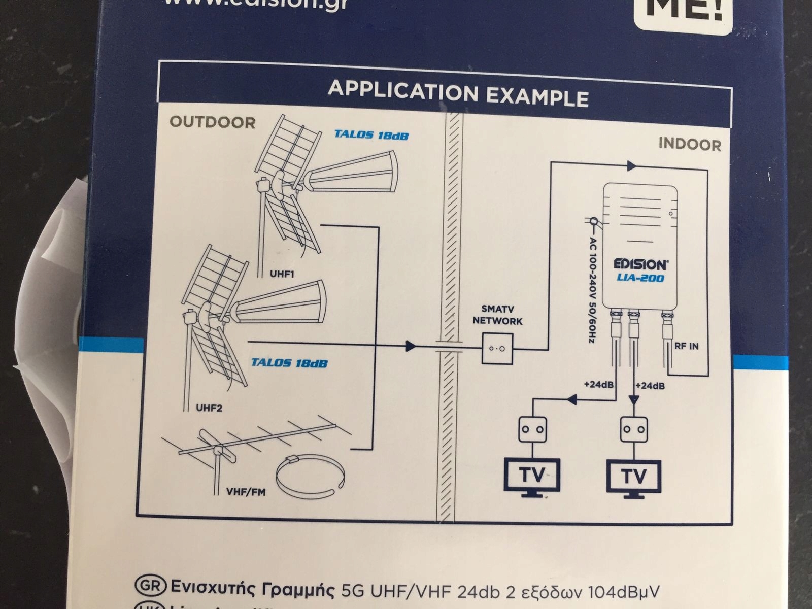 - Регульований UHF від 12 до 24 дБ / VHF -2 дБ при 14 дБ, Важливо: лінійний підсилювач ідеальний, якщо сигнал до роз’єму телевізора низький