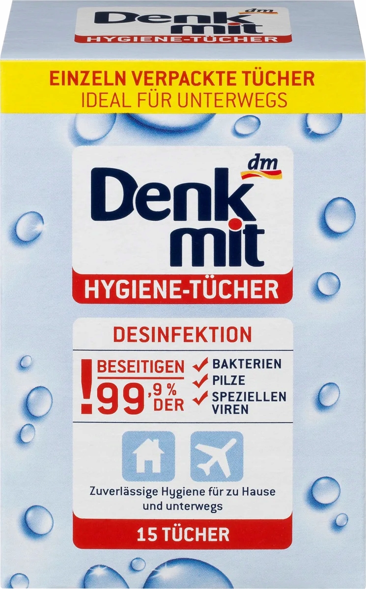 Насичені гігієнічні серветки Denkmit надзвичайно швидко та надійно очищають та дезінфікують усі поверхні та предмети, які можна мити. Завдяки цьому вони забезпечують додатковий захист від хвороб та інфекцій. Серветки упаковані окремо, практичні у використанні - ідеальні для дому та подорожей.