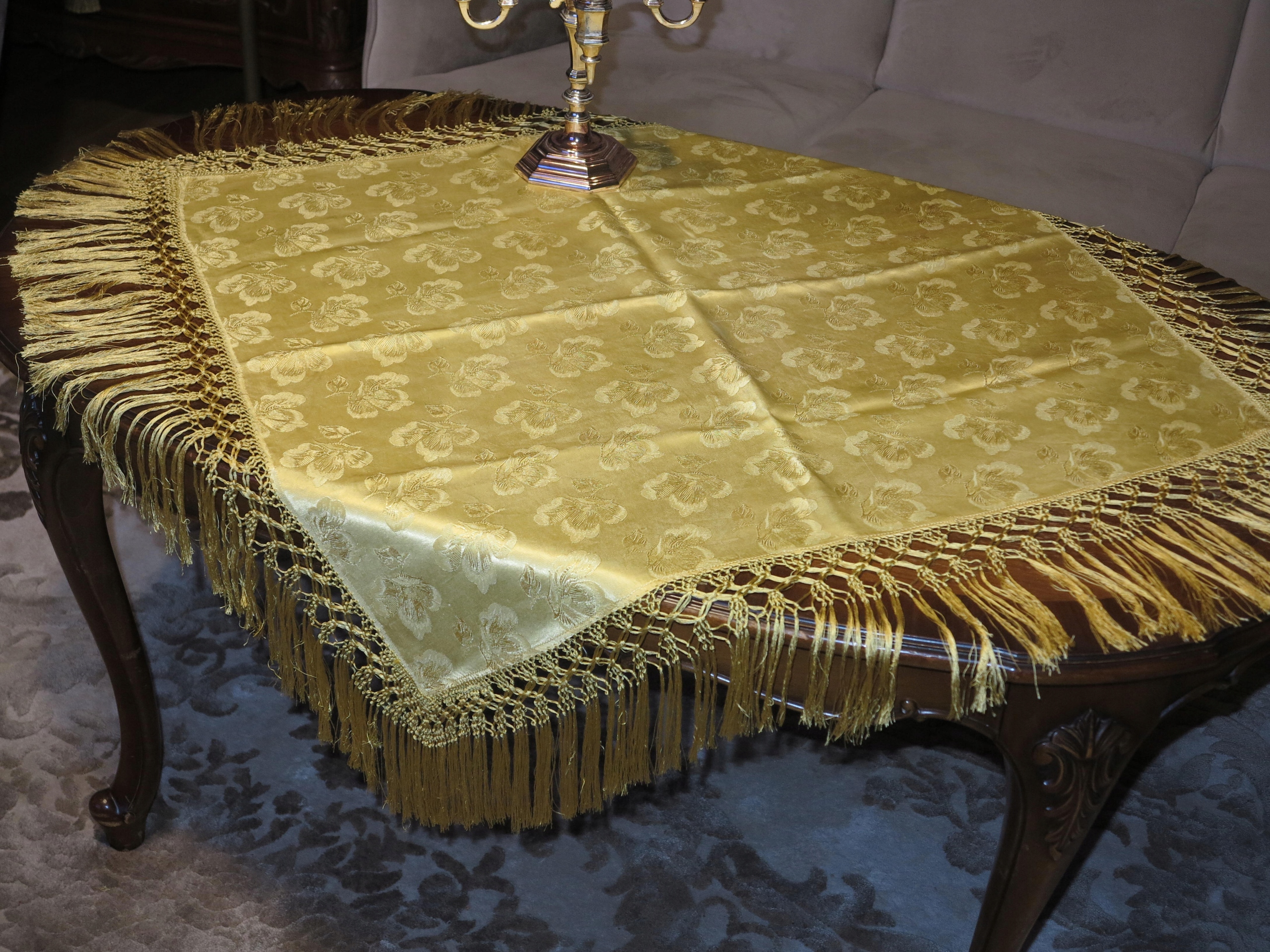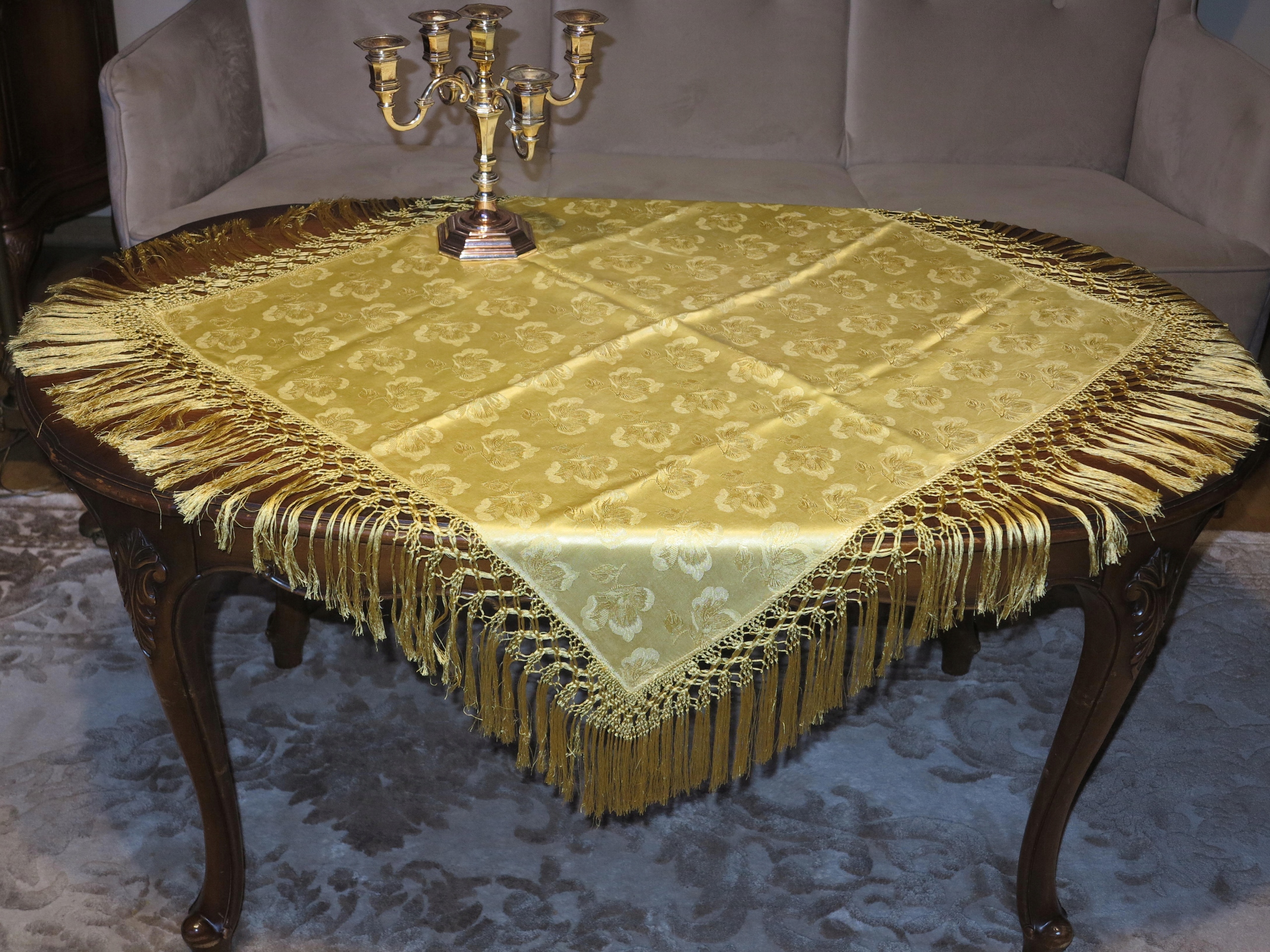 АНТИЧНА - ГАРНА ЗОЛОТА СКАТЕРТИНА З ДОВГИМИ РОЗПУСТИМИМИ БАХОМКАМИ - 79/73см+16см