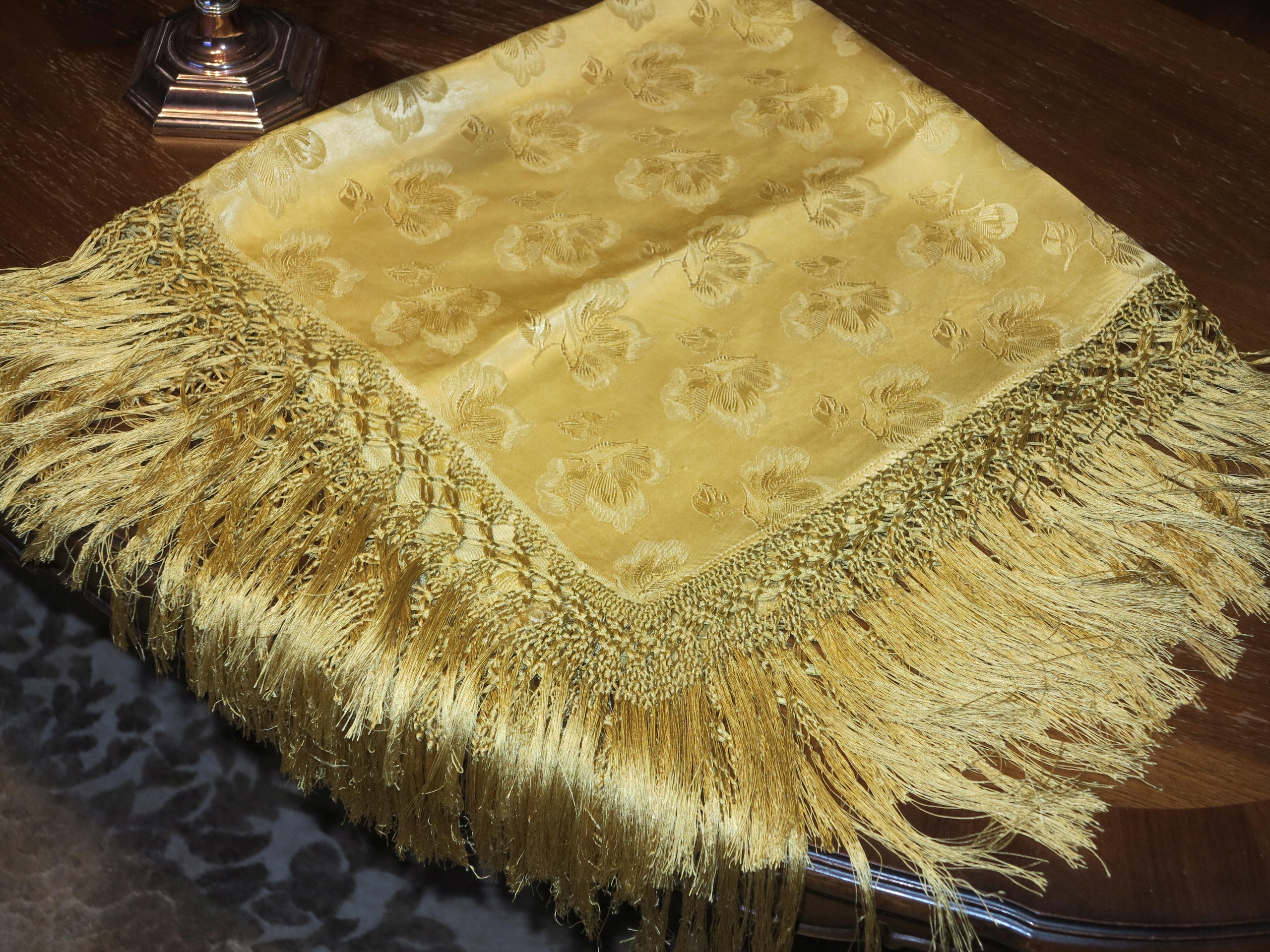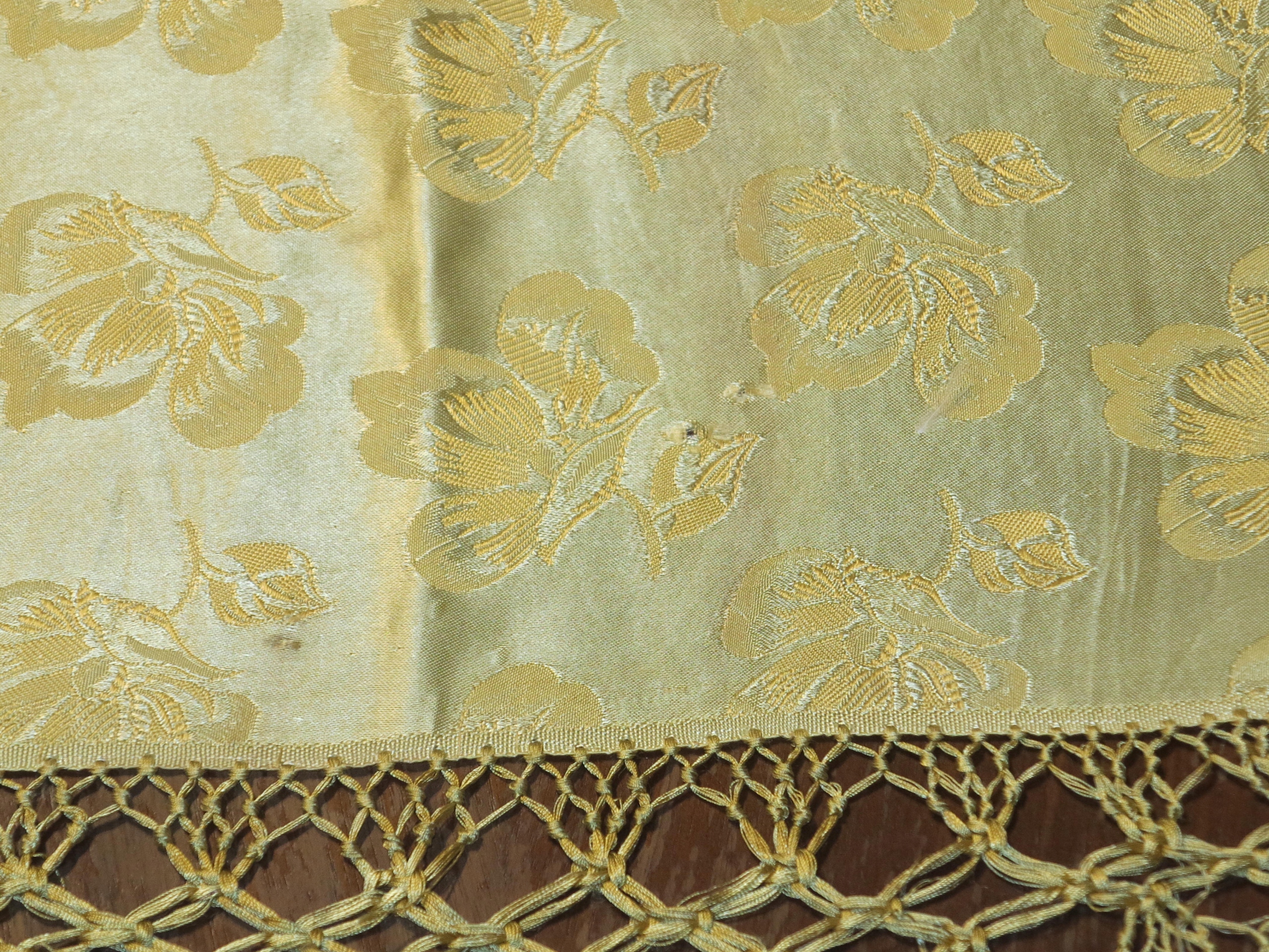 АНТИЧНУ - ГАРНУ СКАТЕРТИНУ З СТОЛІТНЬОГО ЗОЛОТА З ШОВКУ ТА БАВОВНЯНОЇ ТКАНИНИ З КВІТКОВИМ РИСУНКОМ. НАВКОЛО З ДОВГИМИ, РОЗПУСТИМИМИ, ШОВКОВИМИ БАХОМАМИ
