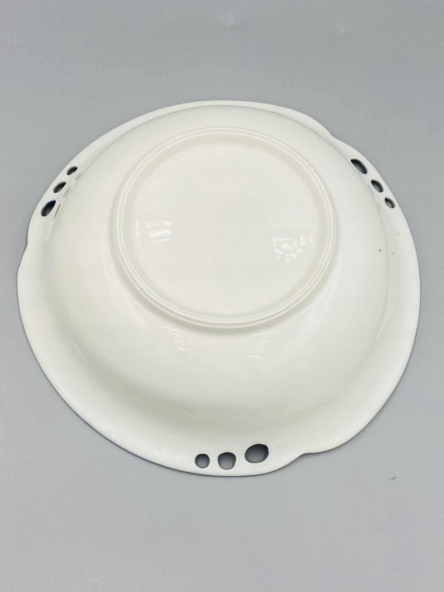Біла порцеляна, прикрашена античним сюжетом та позолотою. Тиснення. Пластикові верхні кромки у формі трьох хвиль і трьох завитків. У перлинному ажурному розписі. У центрі стародавня сцена.