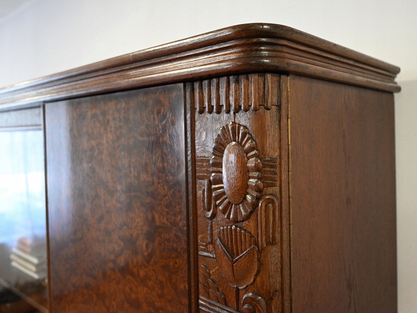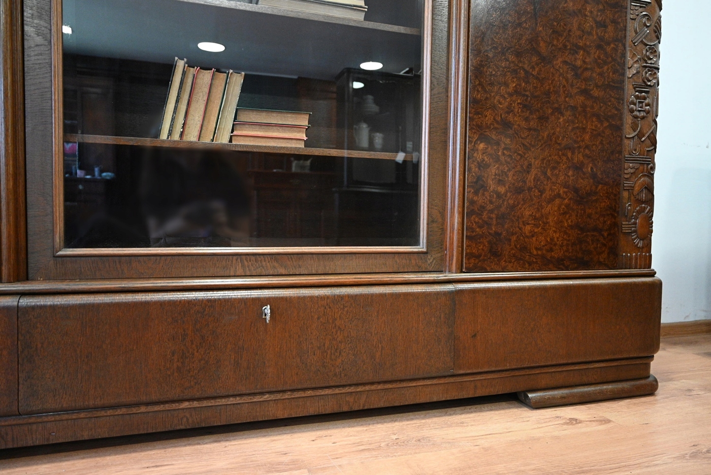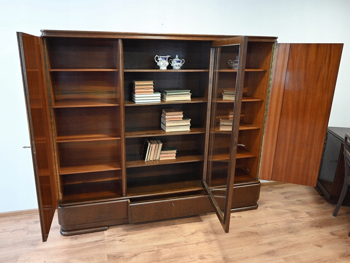 Дуже хороший стан. Меблі, підготовлені до використання. Зовнішні поверхні та центр меблів були оновлені. Меблі вже мають свої роки та сліди минулого часу, що не впливає на його естетичний прийом, вони є свідченням справжності меблів. Бібліотеку можна відразу поставити в квартиру.