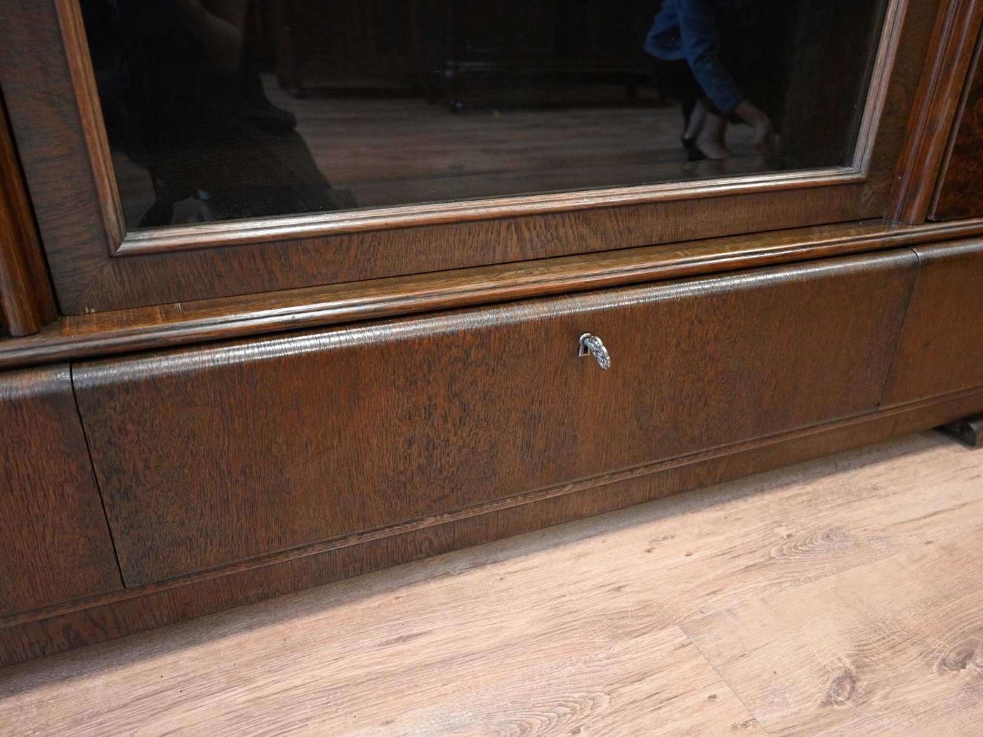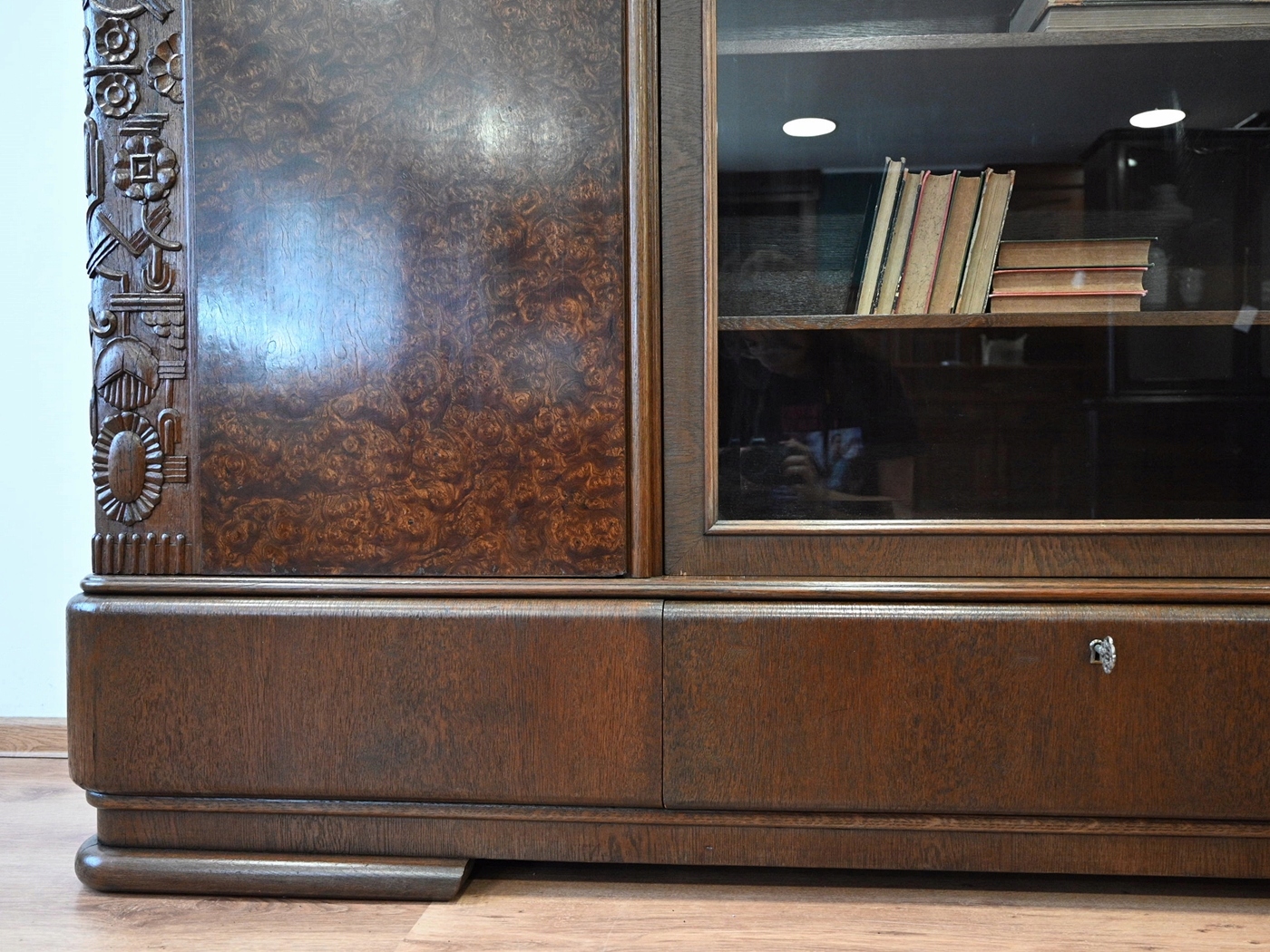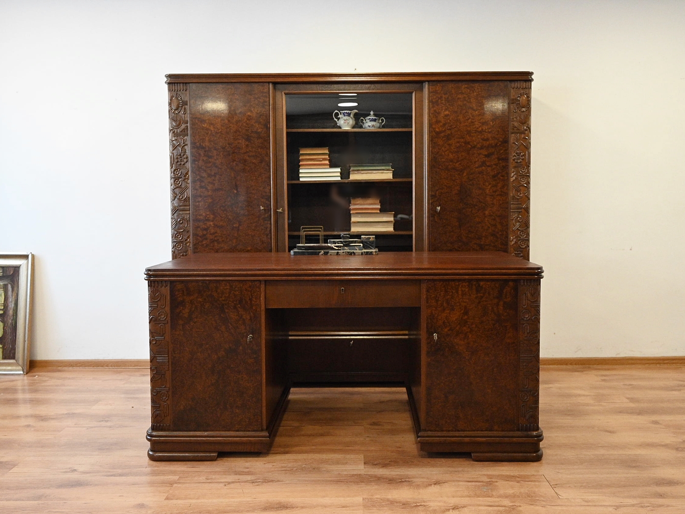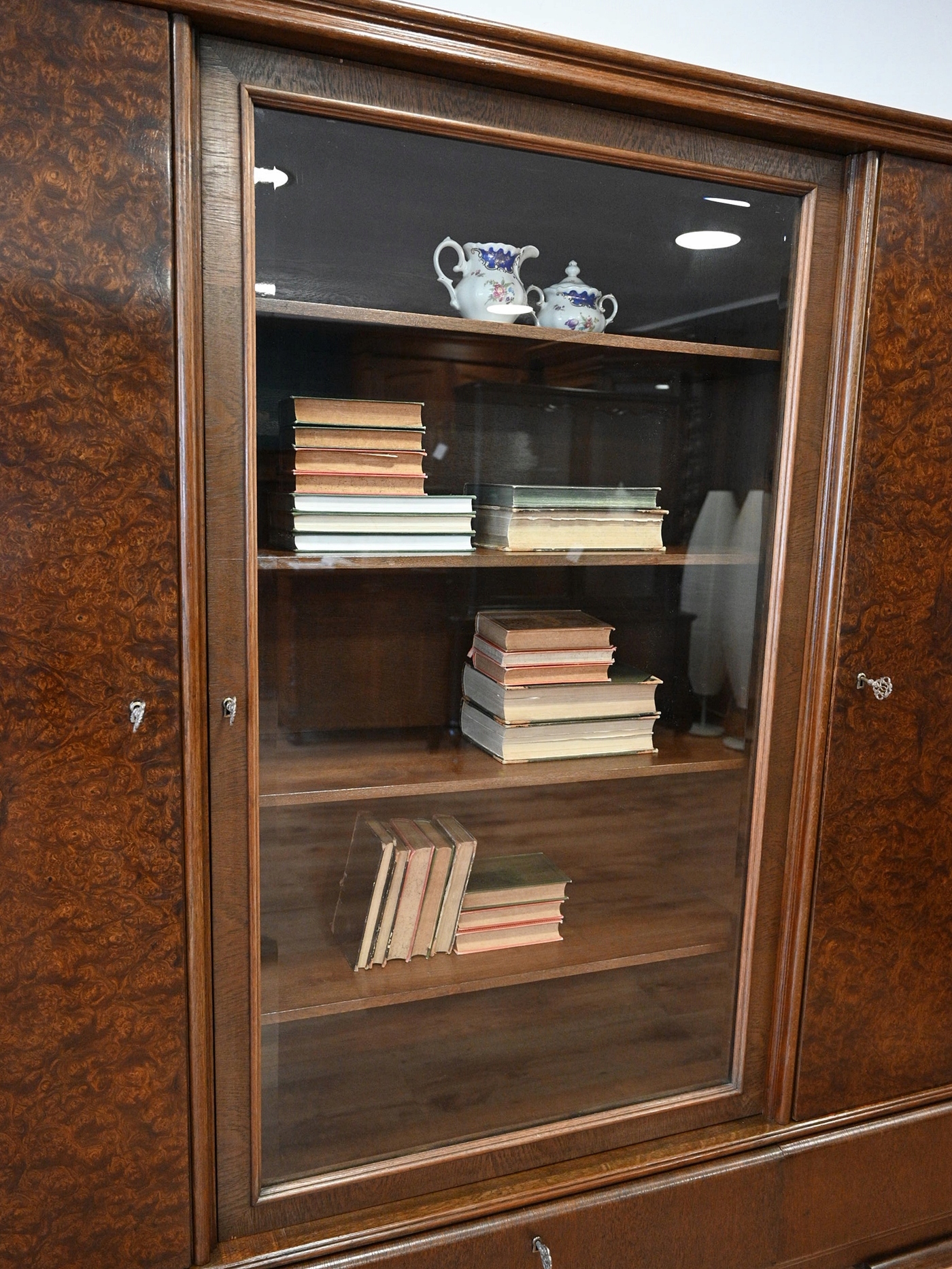 Дуже хороший стан. Меблі, підготовлені до використання. Зовнішні поверхні та центр меблів були оновлені. Меблі вже мають свої роки та сліди минулого часу, що не впливає на його естетичний прийом, вони є свідченням справжності меблів. Бібліотеку можна відразу поставити в квартиру.