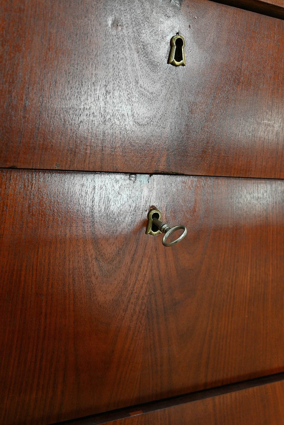 виготовляється повністю з дерева, шпонованого Махоном. Меблі, підготовлені до використання. Зовнішні поверхні та центр меблів були оновлені. Меблі вже мають свої роки та сліди минулого часу, що не впливає на його естетичний прийом, вони є свідченням справжності меблів. Брудену скриню можна негайно поставити в квартиру.
