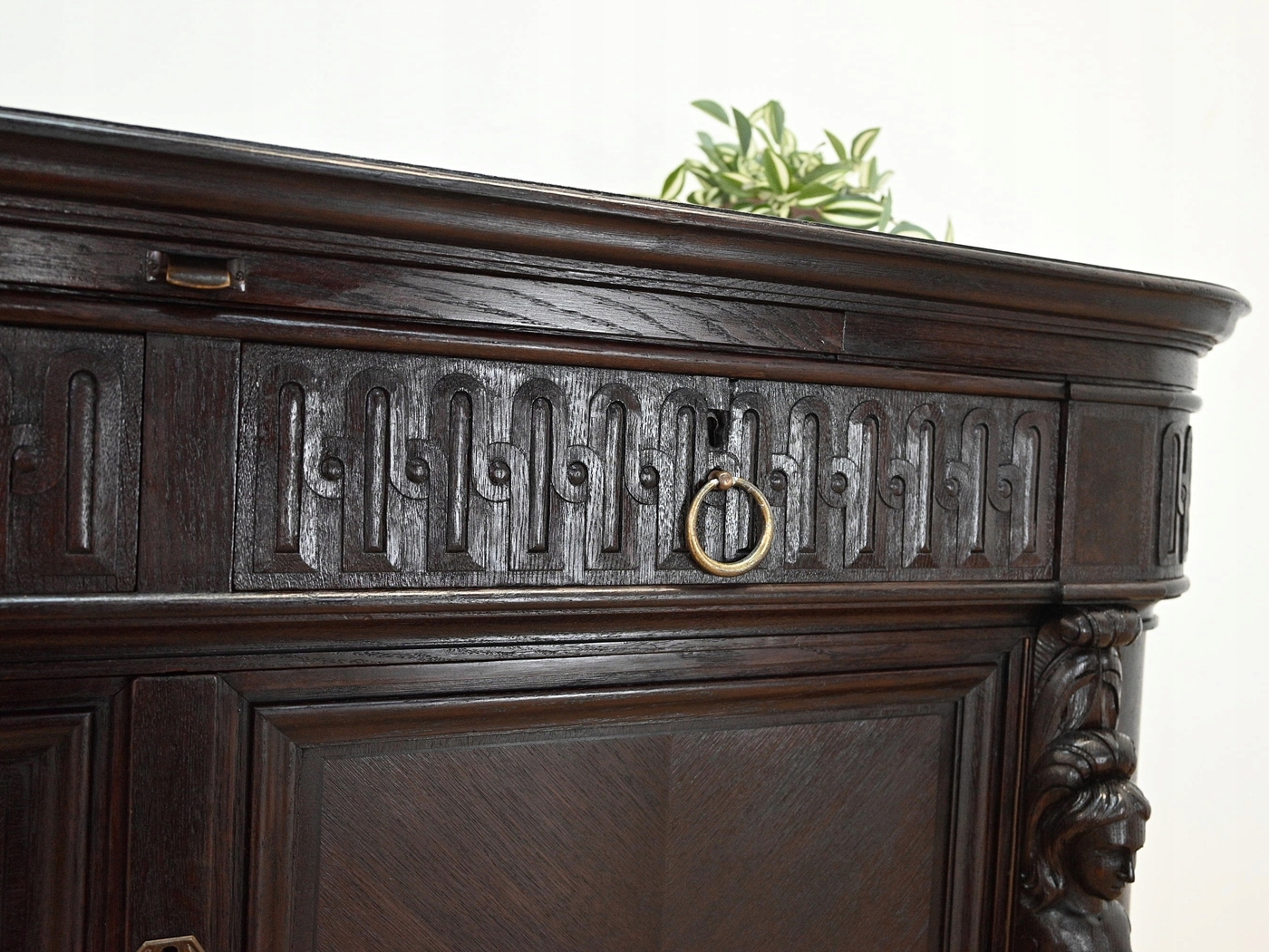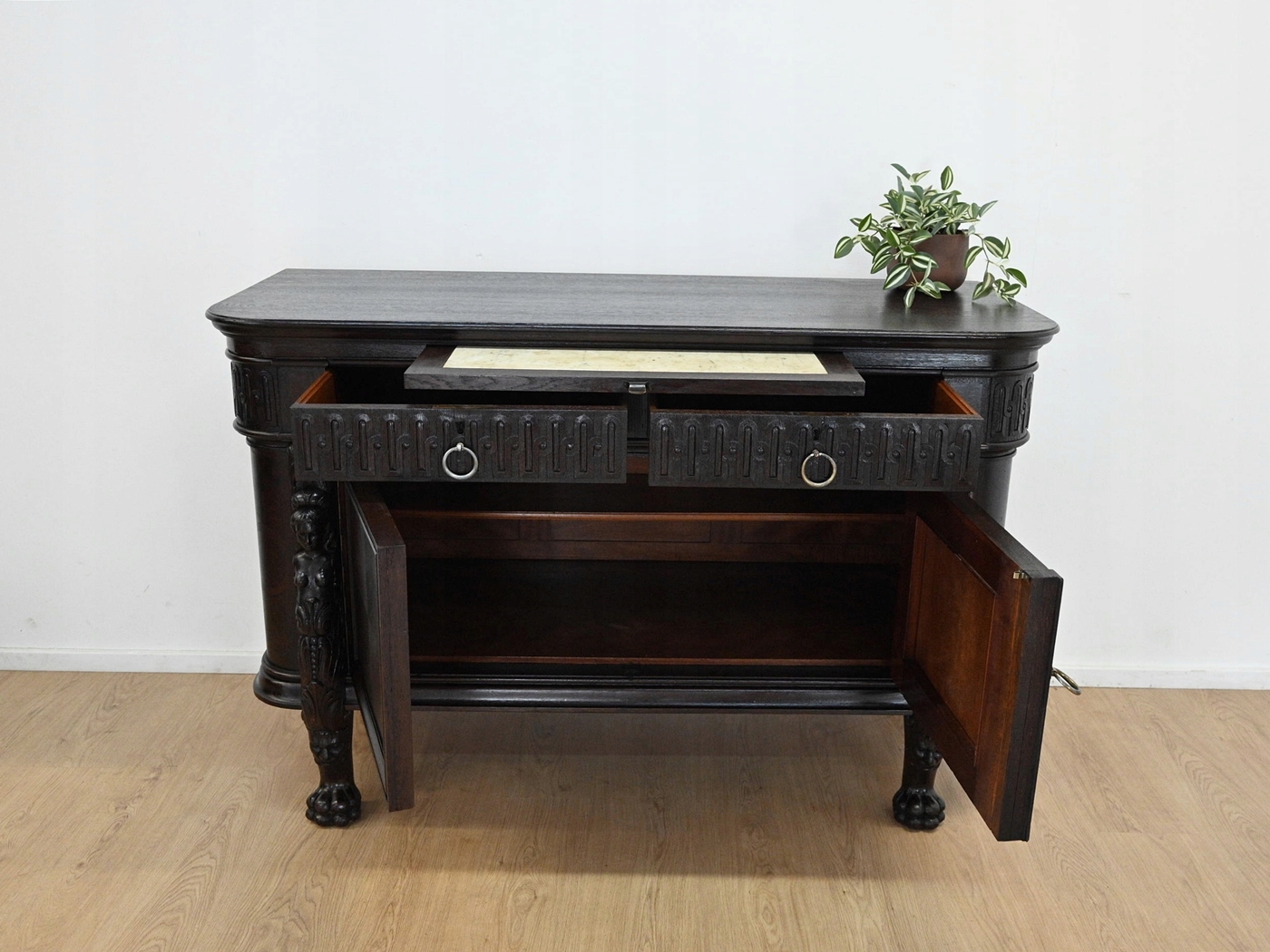 Дуже хороший стан. Меблі, підготовлені до використання. Зовнішні поверхні та центр меблів були оновлені. Меблі вже мають свої роки та сліди минулого часу, що не впливає на його естетичний прийом, вони є свідченням справжності меблів. Комод можна відразу помістити в квартиру.