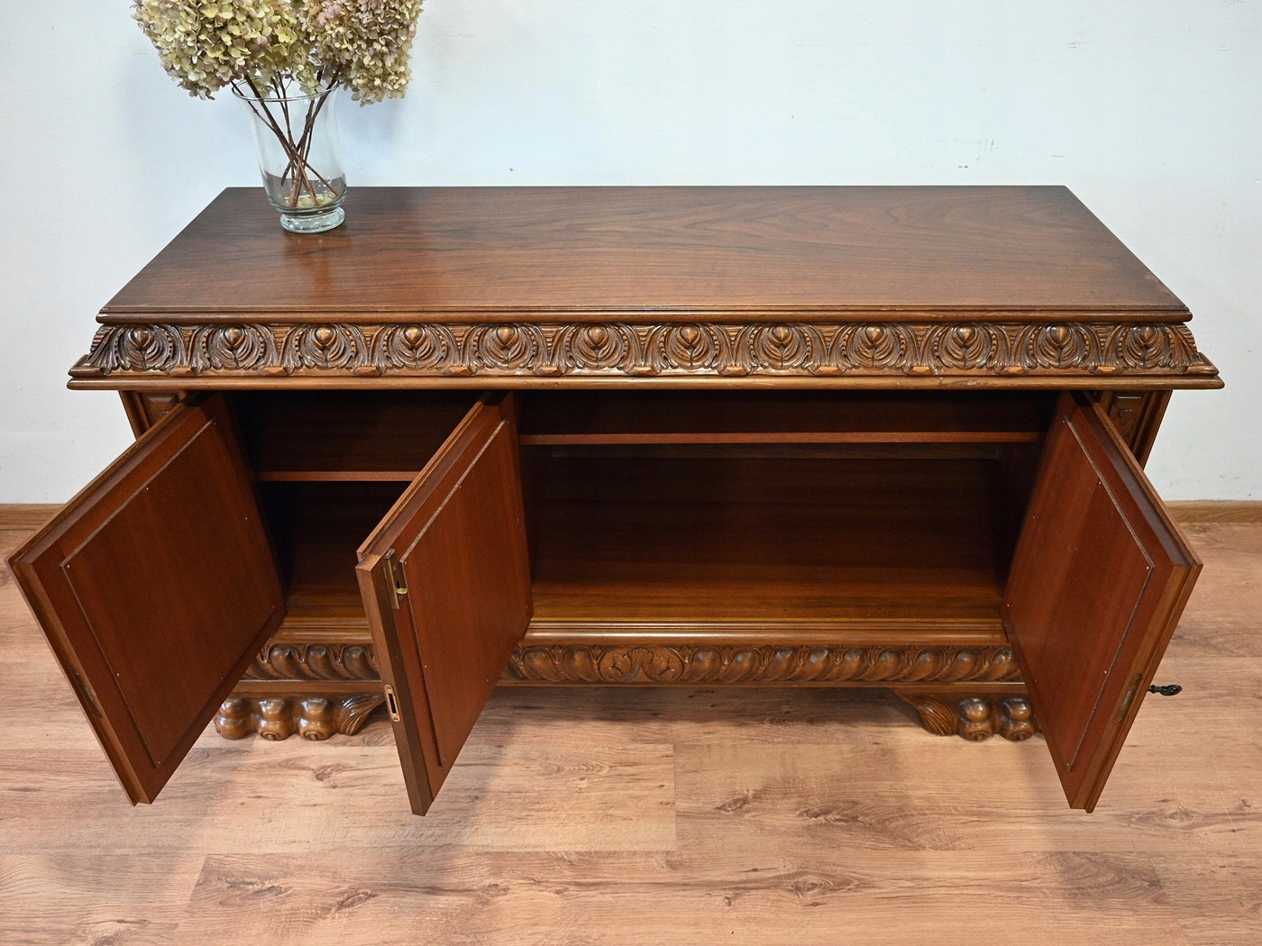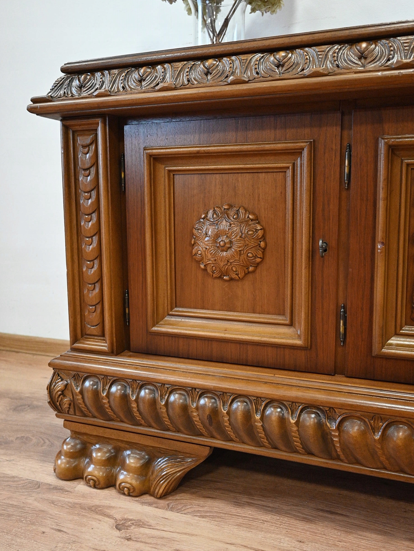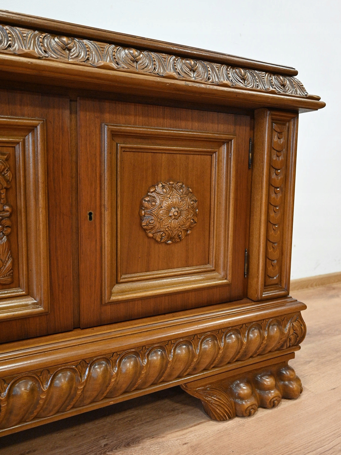 Дуже хороший стан. Меблі, підготовлені до використання. Зовнішні поверхні та центр меблів були оновлені. Меблі вже мають свої роки та сліди минулого часу, що не впливає на його естетичний прийом, вони є свідченням справжності меблів. Брудену скриню можна відразу помістити в квартиру.