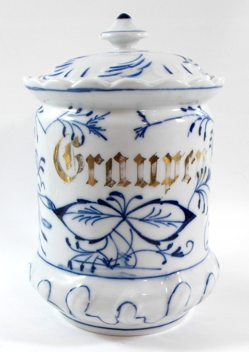 Предметом аукціону є старовинна ємність, виготовлена з білої порцеляни, прикрашена візерунком кобальтової цибулі.