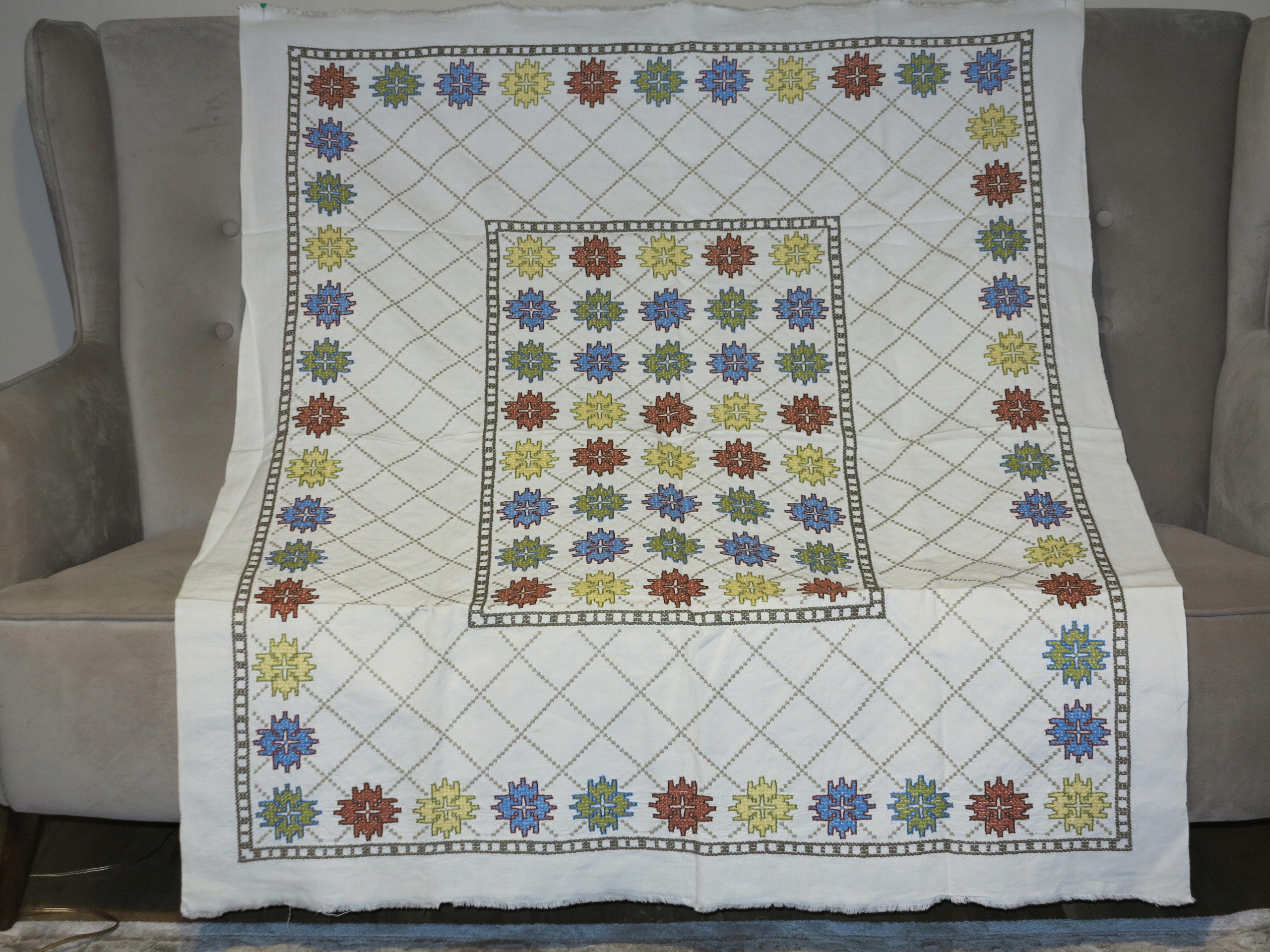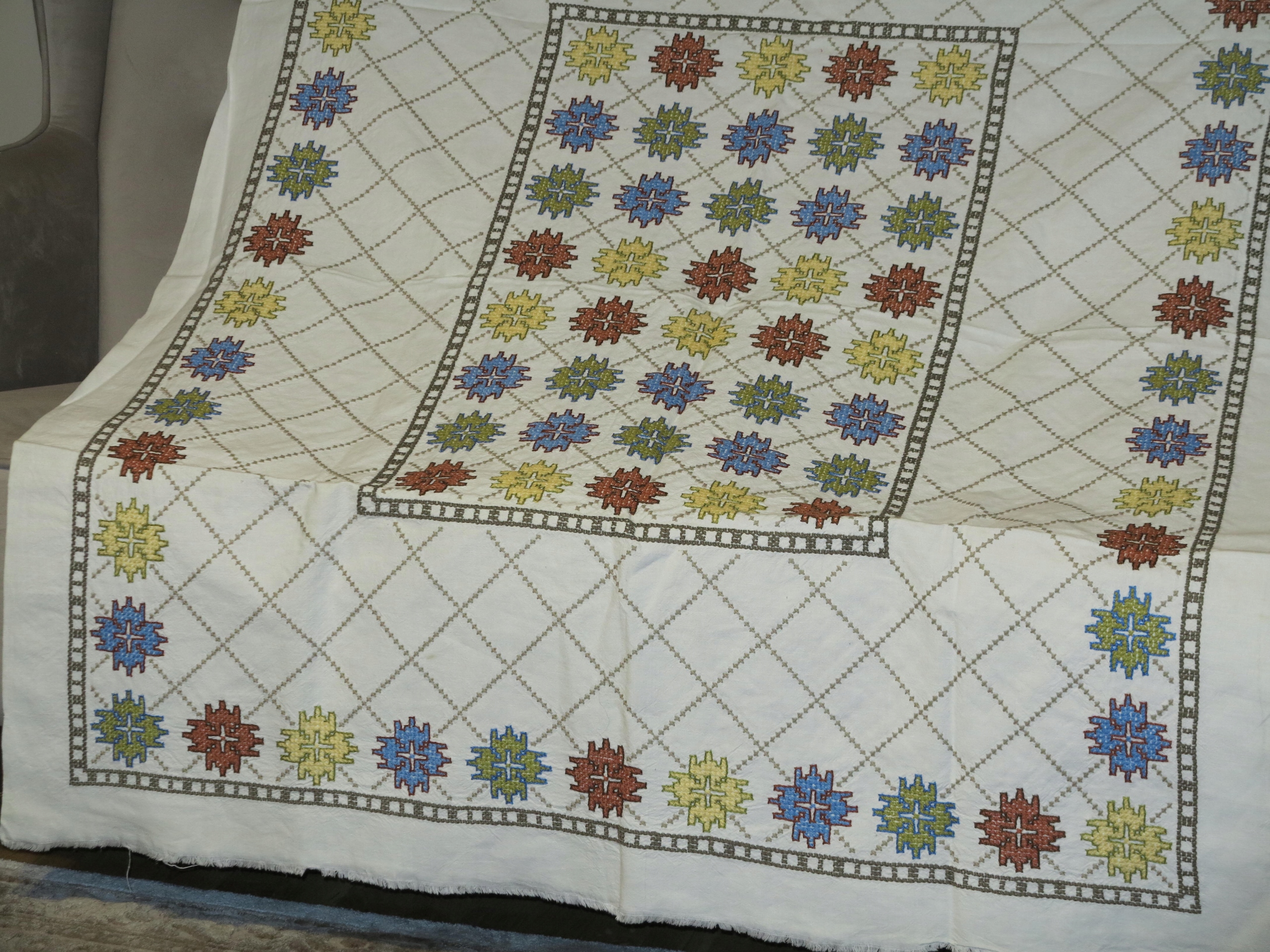 Предметом аукціону є старовинна, зістарена лляна скатертина, повністю ручної роботи з кольоровою вишивкою хрестиком. Має розміри: 148/119 см. Скатертина б/у, але в дуже хорошому стані та якості незважаючи на вік. Рекомендую