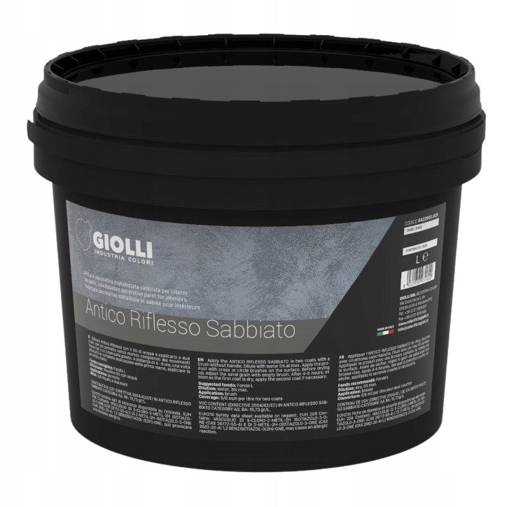 antico rifleso argento - effecto sabbiato Це ексклюзивна, акрилова, миюча, металізована спеціальними срібними пігментами, декоративною фарбою з кварцовим піском для в приміщенні. Ми отримуємо покриття, що складається з по черзі з гладких і злегка шорстких поверхонь, які ще більше підкреслюють декоративний ефект, пов'язаний з легким металевим сяйвом. Металеві пігменти змушують поверхню покритим цим продуктом змінювати зовнішній вигляд залежно від кута захворюваності на світло та його кількості. в більш інтенсивних кольорах, для найкращого ефекту, рекомендується наносити фарбу на поверхню, попередньо намальовану акриловою фарбою, аналогічним кольором.