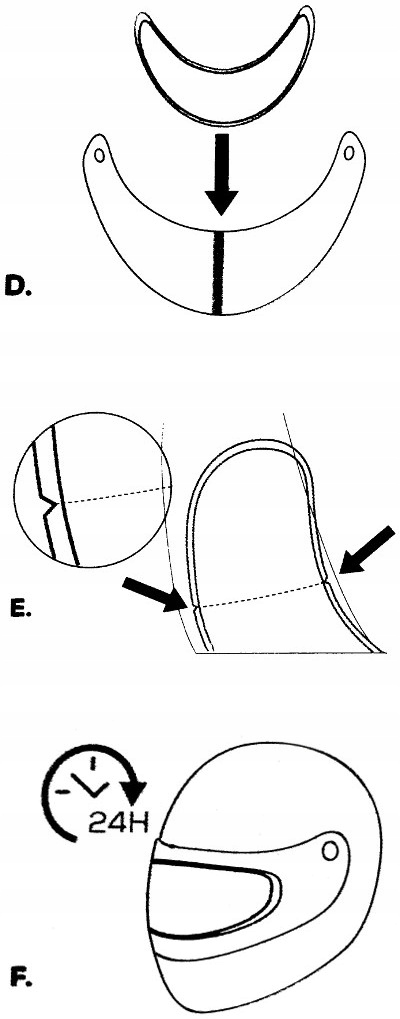 ✔ Крок 1: Закрийте видошукач шолома, натисніть його якомога більше (мал. А). На склеєній стрічці виберіть запланований верхній край фольги та точний центр видошукача. Це слід використовувати для тонкого авториста або маркера, який не буде прибитий склеєною стрічкою і не залишить жодного сліду на обгорненому глядачеві під стрічкою (мал. B на зображенні поруч). Кромка отвору фольги повинен бути запланований на висоті, на якій вона не буде натиратися на ущільнення при відкритті та закриттях глядача під час подальшої роботи. 3: Вийміть видошукач з шолома - дотримуйтесь інструкцій виробника вашої моделі шолома, що уникне її пошкодження. Потім переконайтеся, що внутрішня частина видошукача належним чином очищається і пам’ятайте, що кожен бруд і найменший пил залишаться під фольгою, встановленою до кінця її "життя". фольга Fogcity із захисної транспортної плівки. Складіть обережно проти туманну фольгу у формі, що нагадує букву "u". Тримайте фольгу на її край, не торкаючись поверхні на стороні клею. Під час цього кроку направляйте самостійну частину фольги до видошукача, на якому вона повинна бути встановлена (мал. D на зображенні зліва).