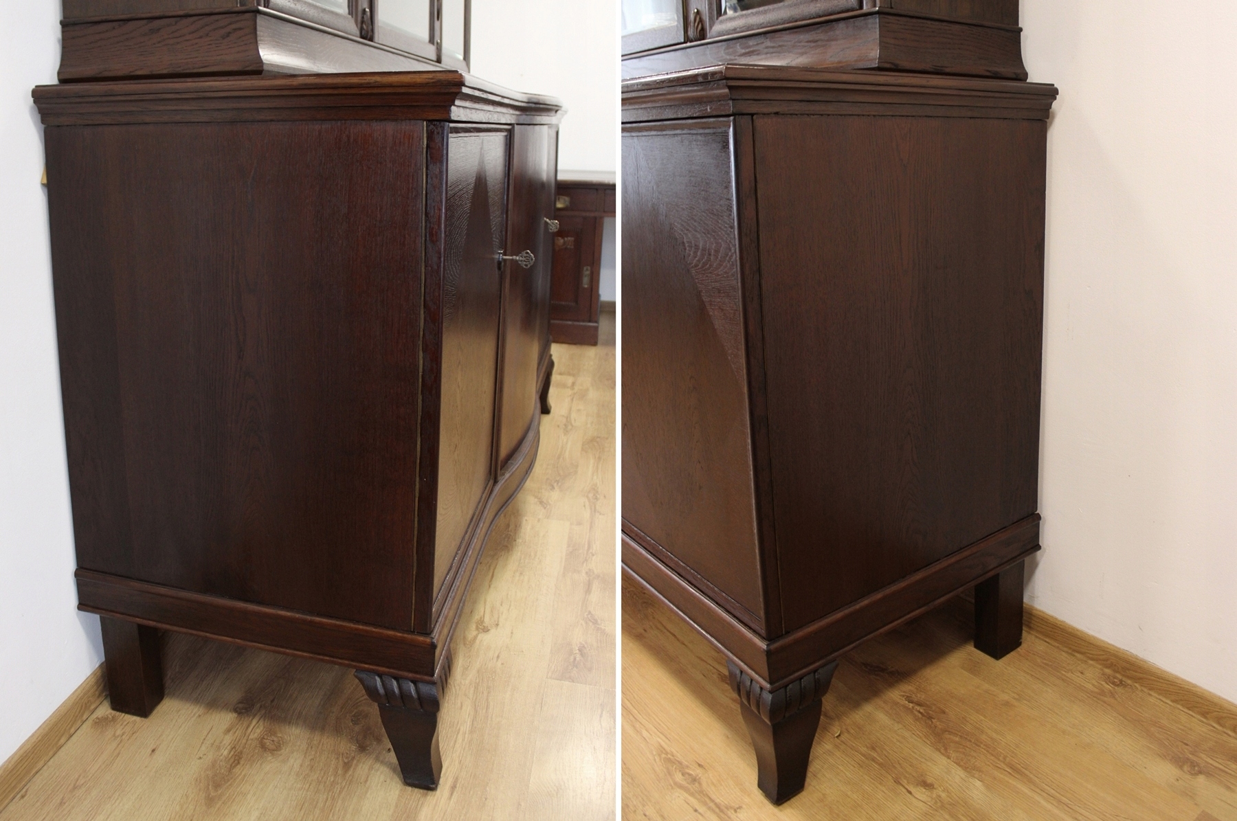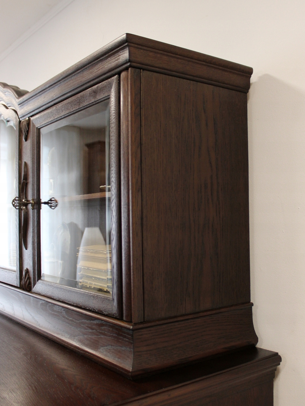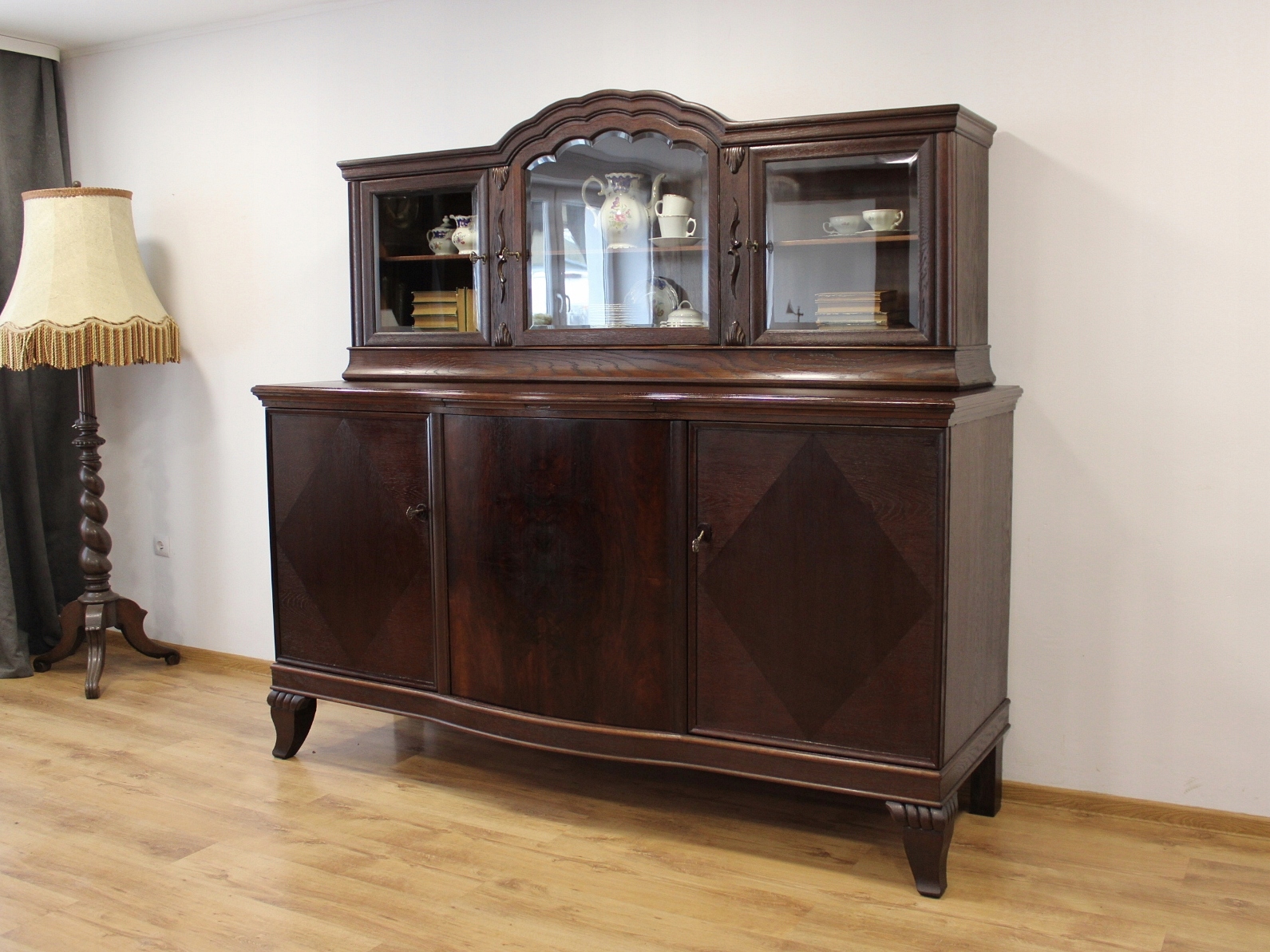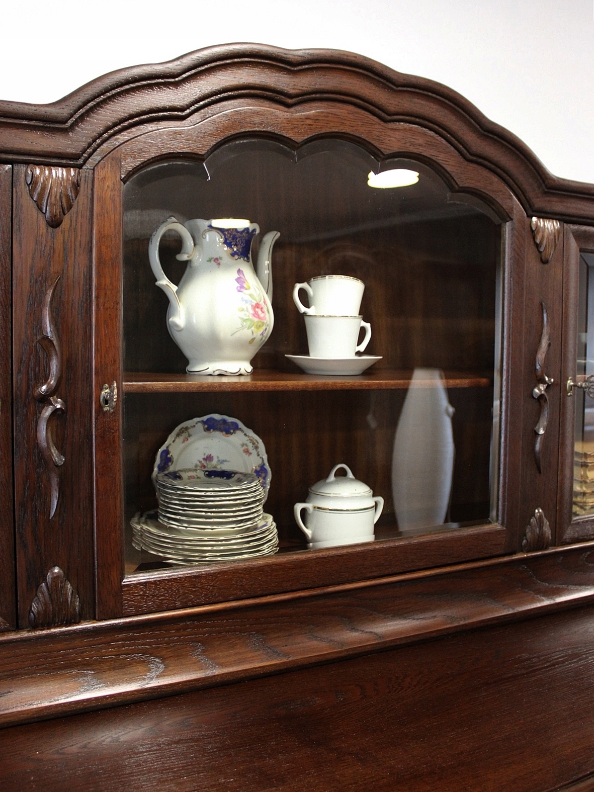 Довгий буфет з високими ніжками, з гарною горіховою основою на нижньому буфеті. Оформлення з великим склінням зі скошеними фасками, делікатно декороване.