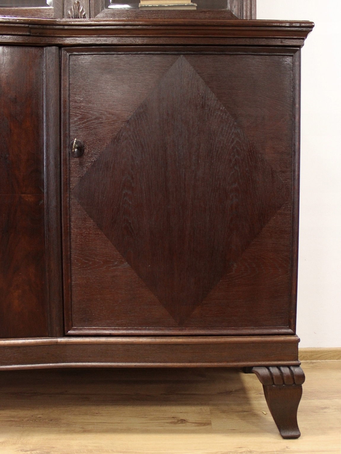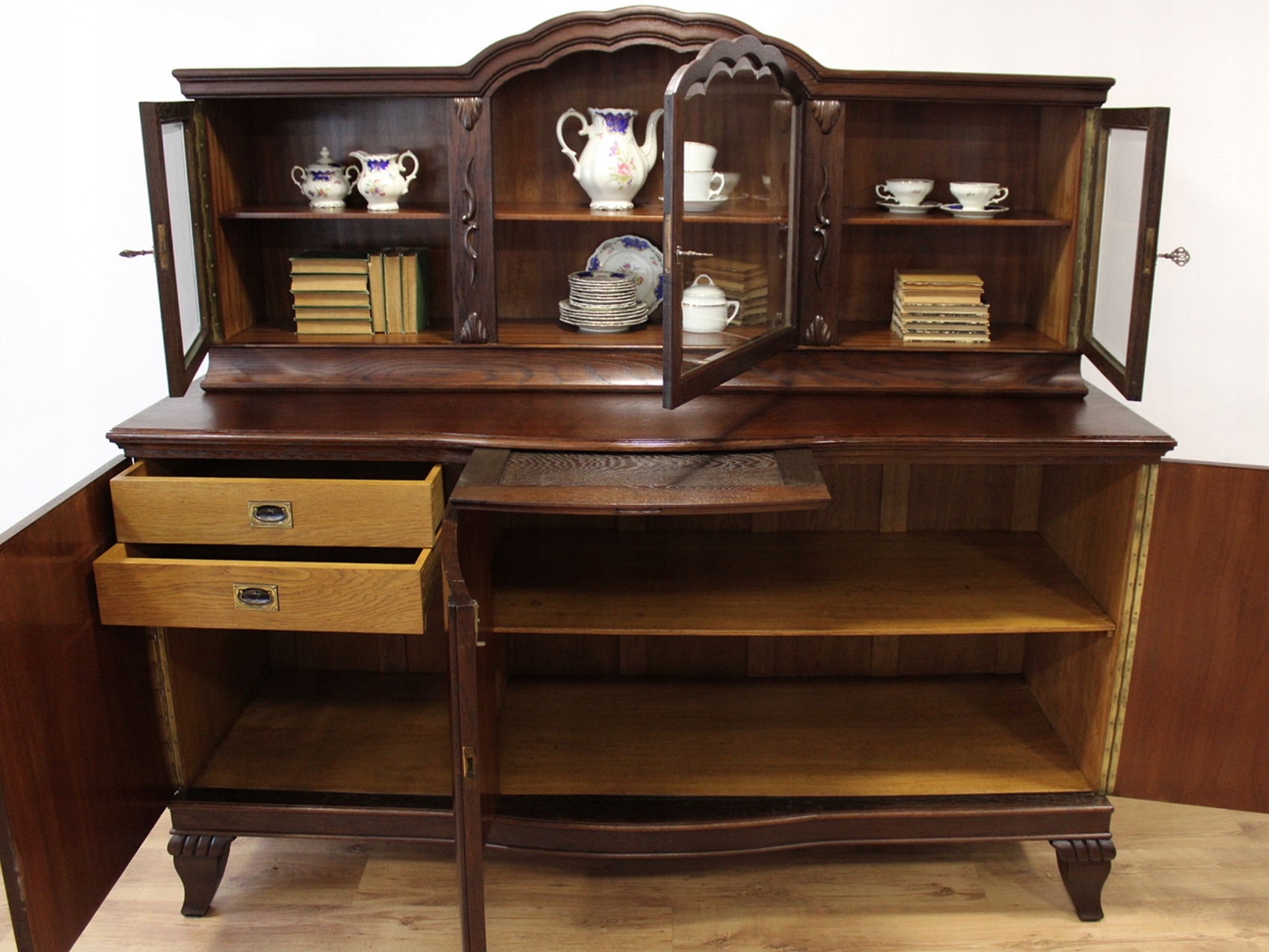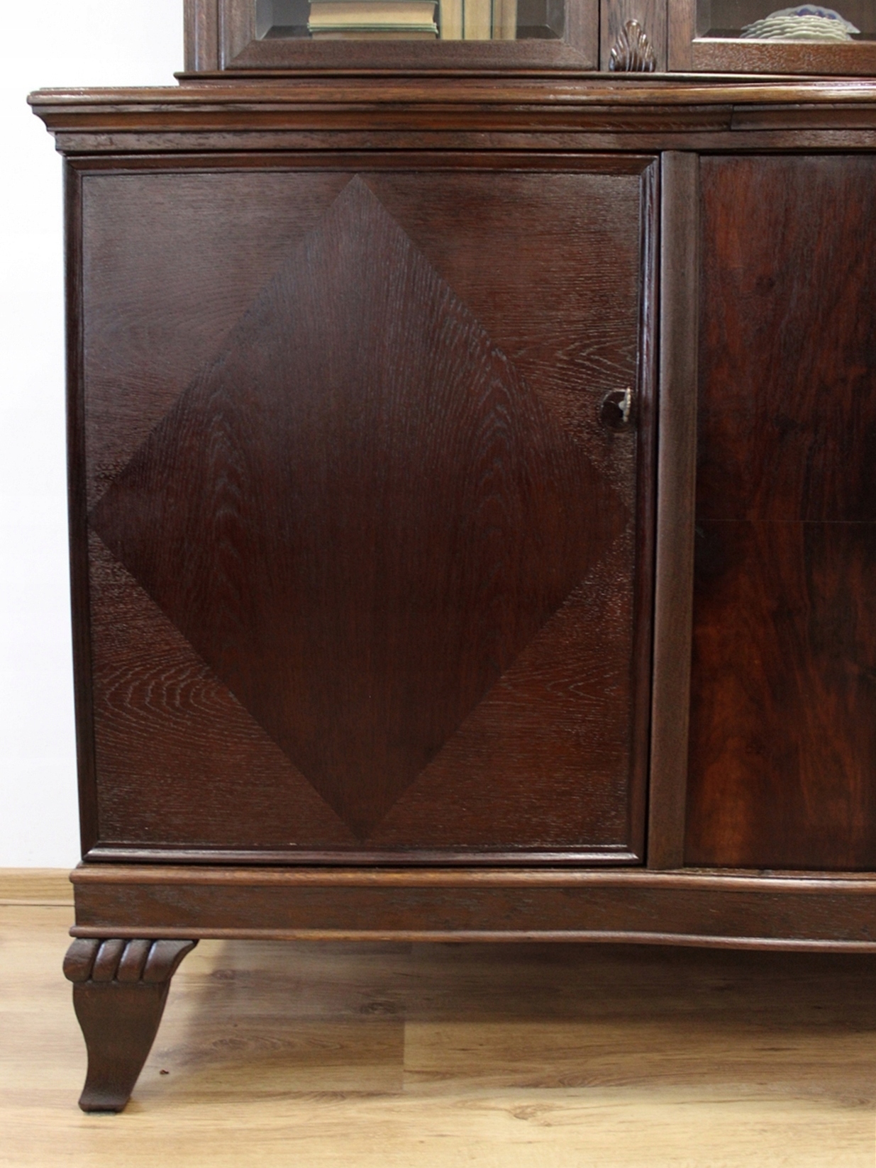 Довгий буфет з високими ніжками, з гарною горіховою основою на нижньому буфеті. Оформлення з великим склінням зі скошеними фасками, делікатно декороване.