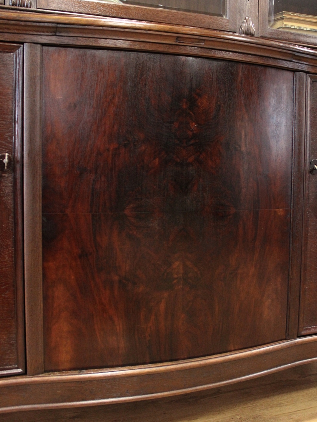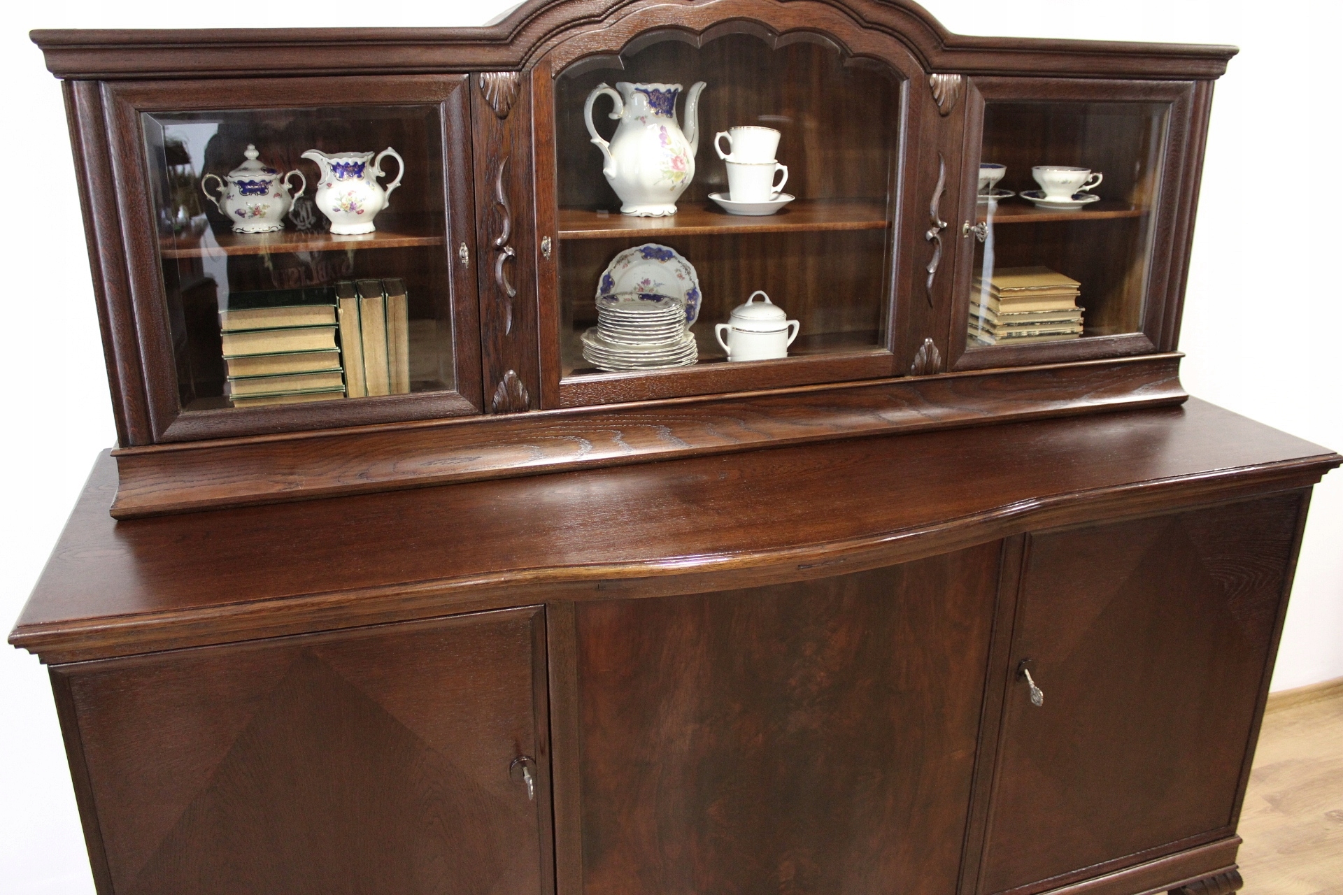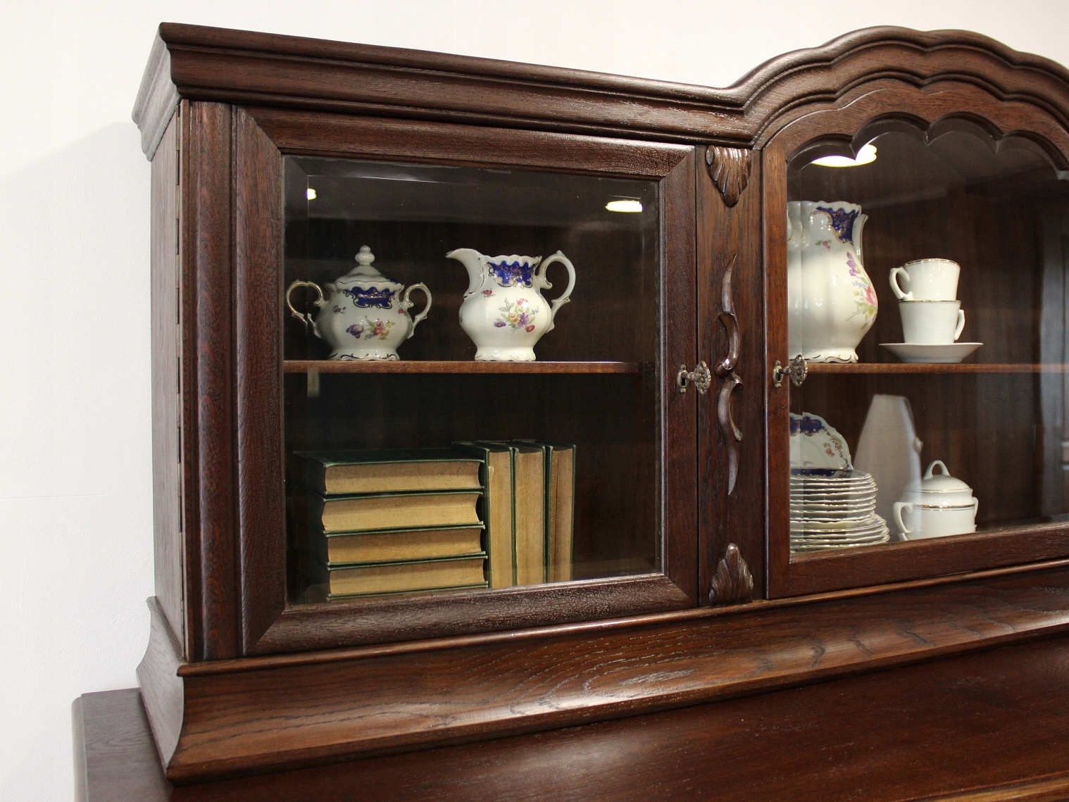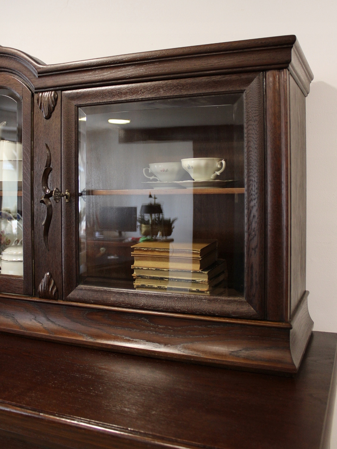 Довгий буфет з високими ніжками, з гарною горіховою основою на нижньому буфеті. Оформлення з великим склінням зі скошеними фасками, делікатно декороване.