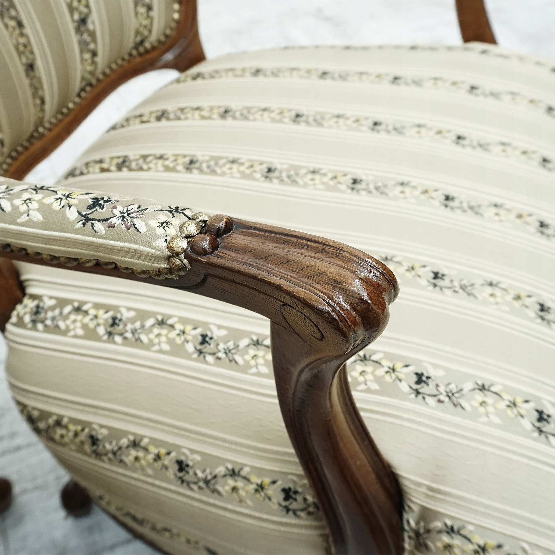 Цей комплект складається з двох крісел і двомісного дивана, який були ретельно виготовлені з матеріалів найвищої якості, що забезпечує їх довговічність і естетичний вигляд протягом багатьох років. Ці меблі відрізняє унікальний дизайн, що відсилає до класичних напрямків. Міцні дерев'яні рами багато прикрашені тонким різьбленням, що підкреслює їх елегантний характер. Смугаста оббивка в теплих бежевих тонах додає інтер'єру тепла і затишку. Малюнок на тканині та ретельна обробка країв заклепками надають меблям неповторного шарму та вишуканого стилю. Цей лаунж-набір чудово підійде як до класичних, так і до еклектичних інтер’єрів, додаючи їм елегантності та шику.