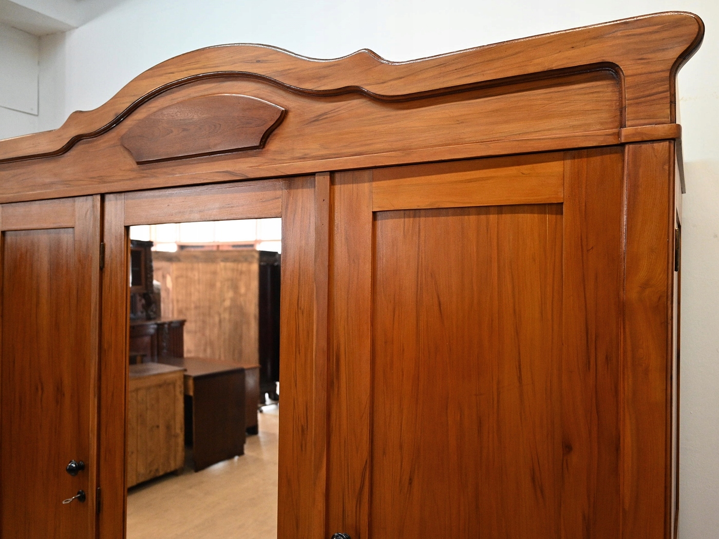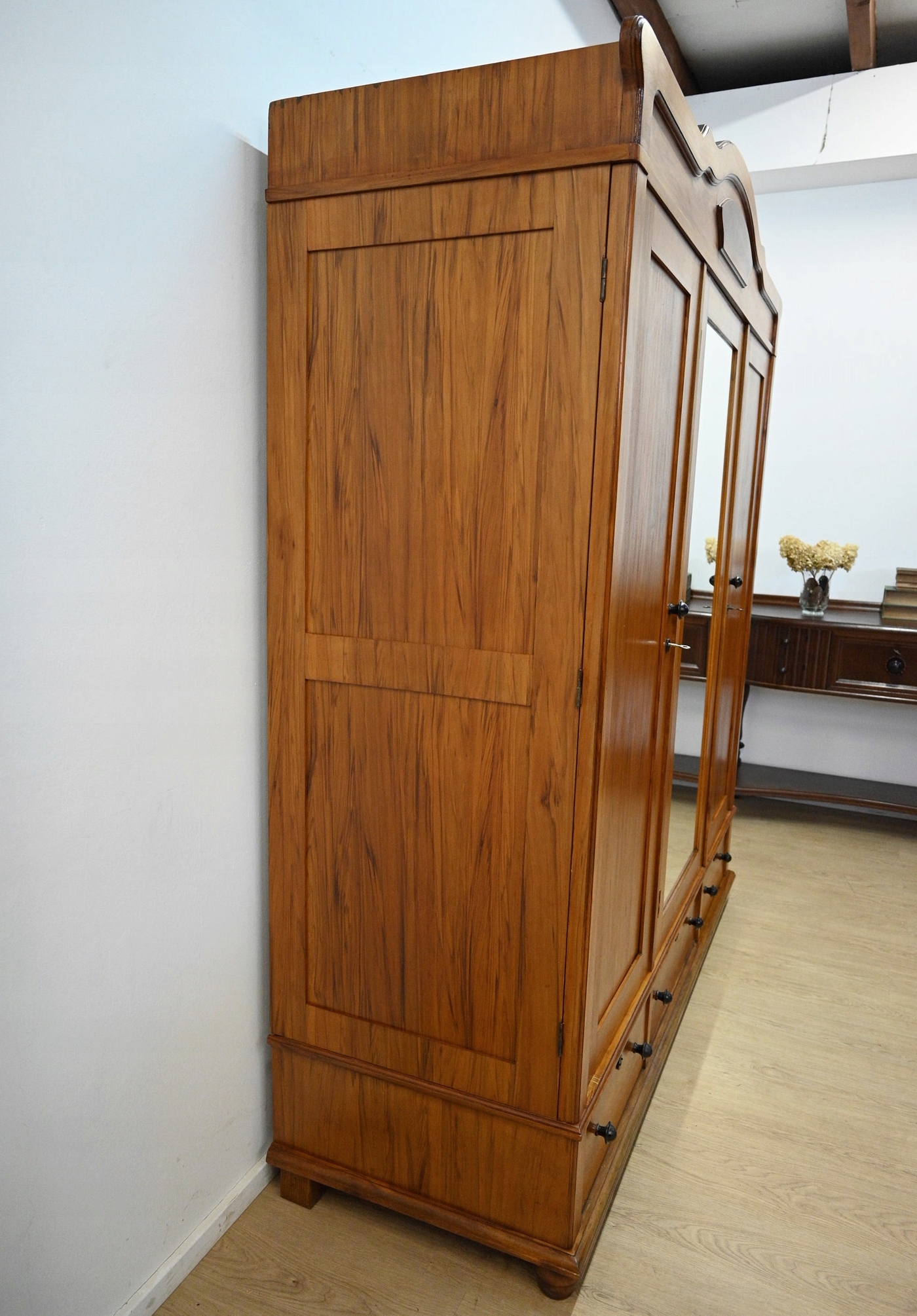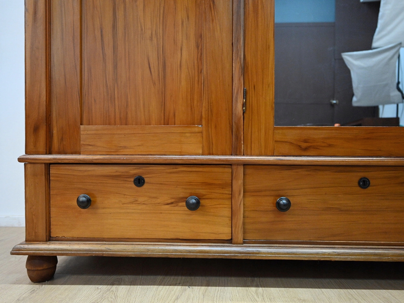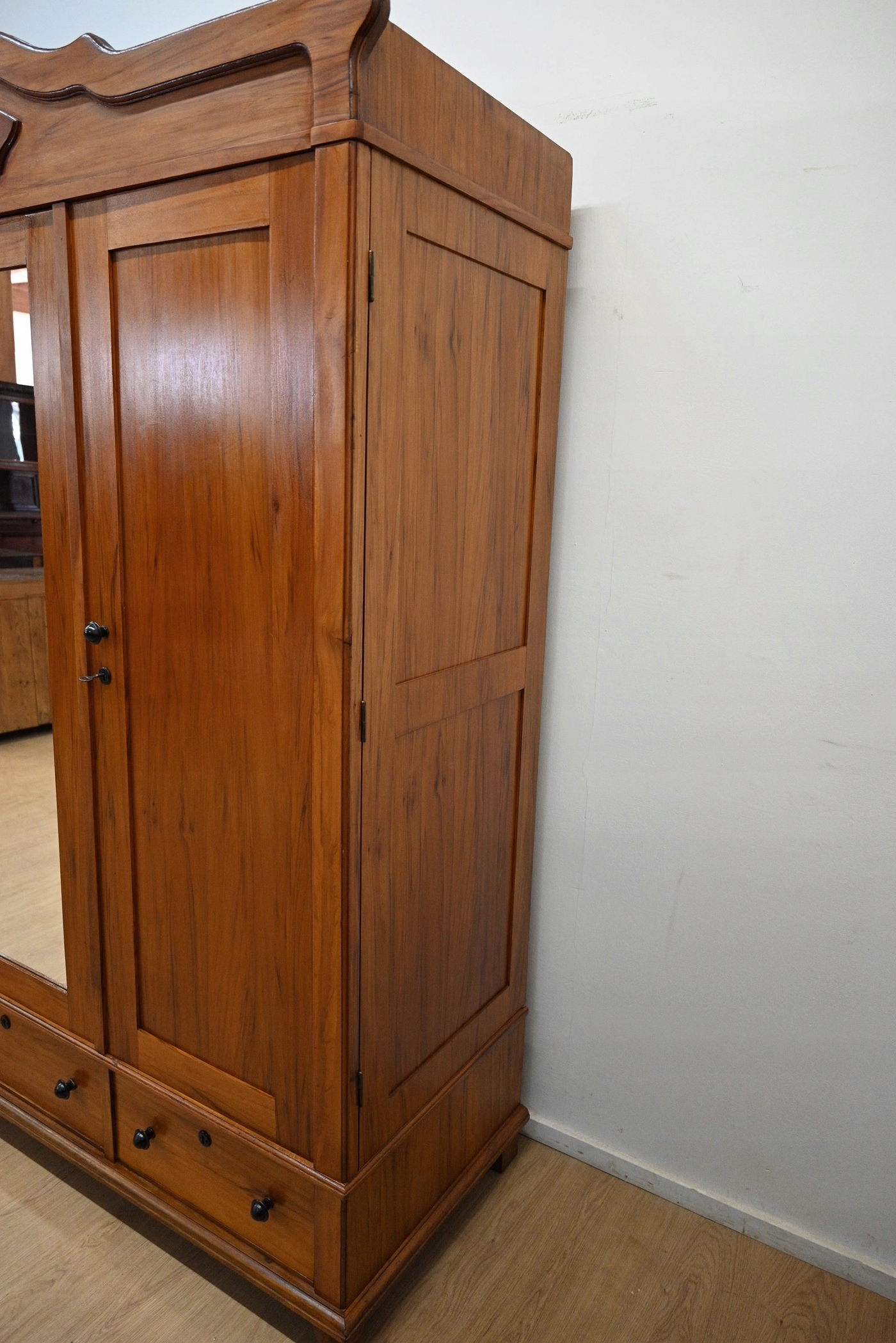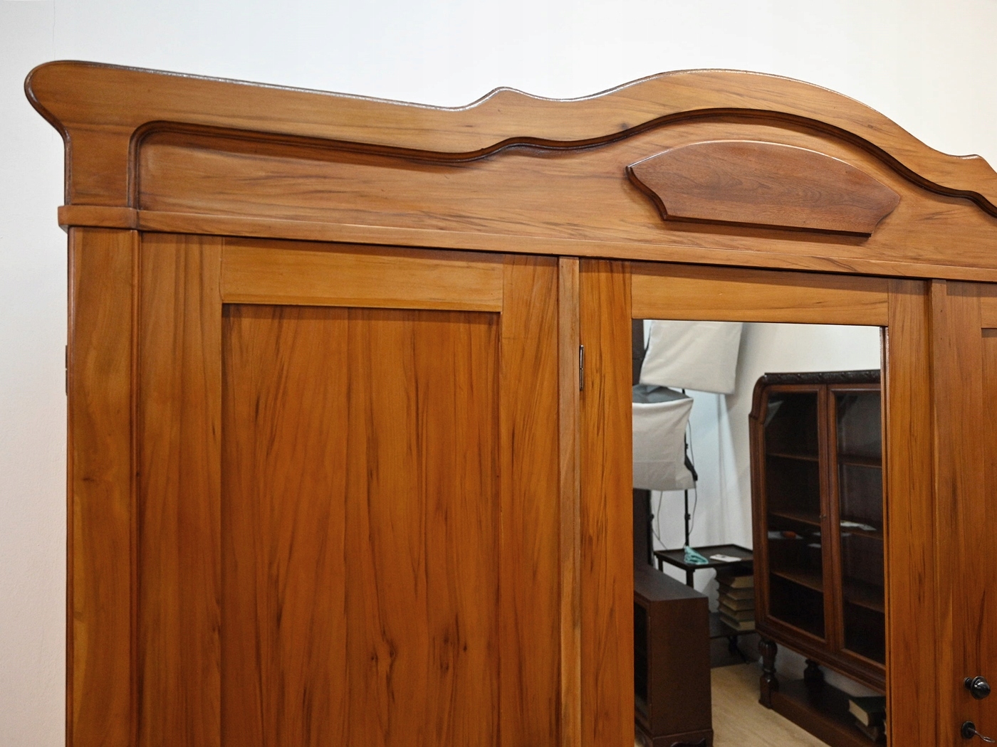 Дуже хороший стан. Меблі, підготовлені до використання. Зовнішні поверхні та центр меблів були оновлені. Меблі вже мають свої роки та сліди минулого часу, що не впливає на його естетичний прийом, вони є свідченням справжності меблів. Гардероб можна негайно поставити в квартиру.