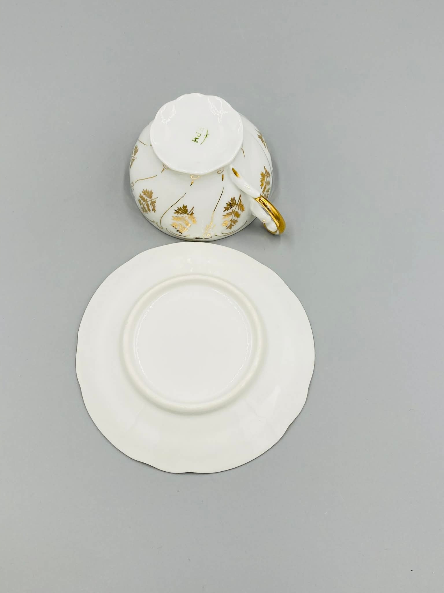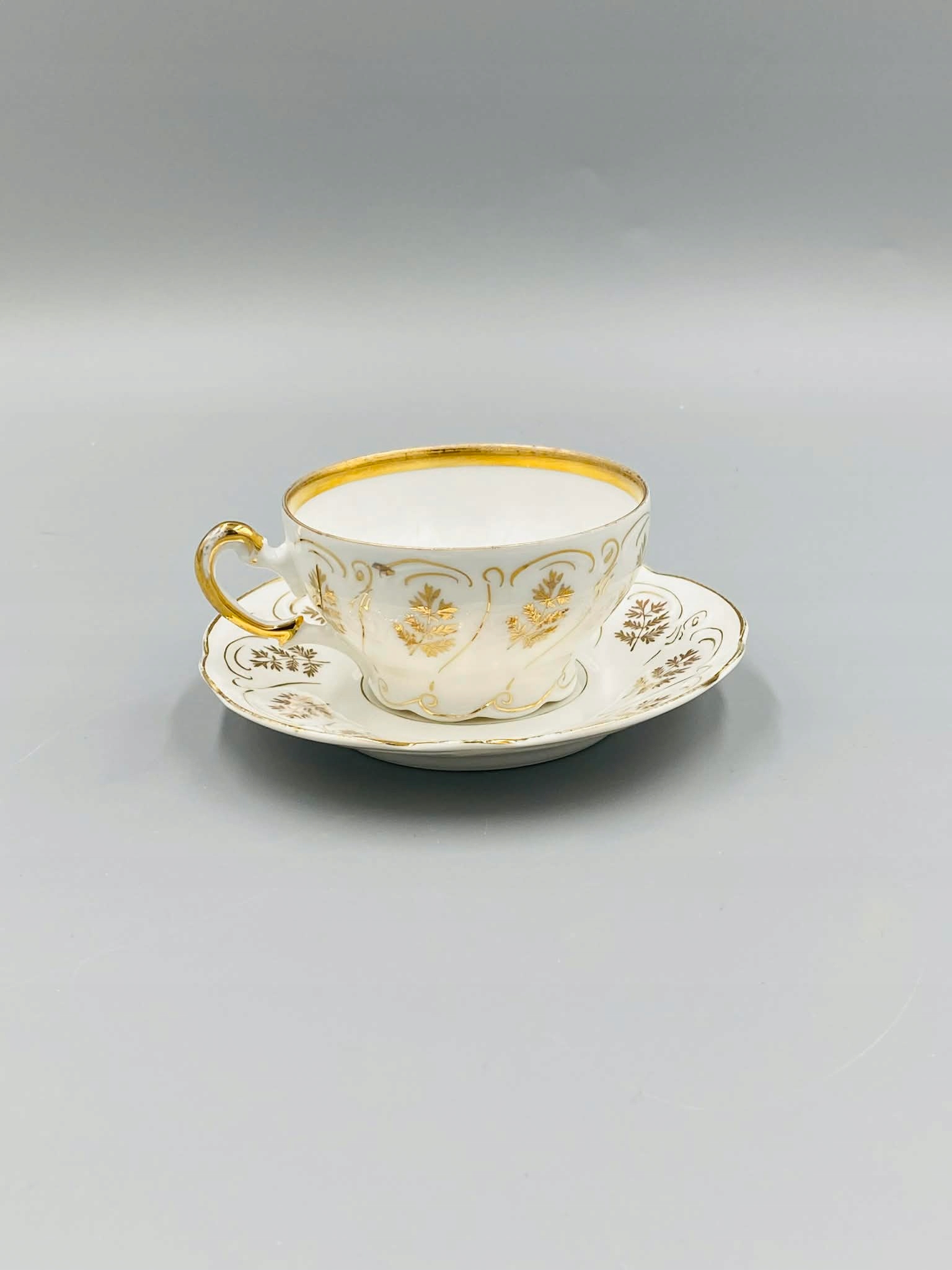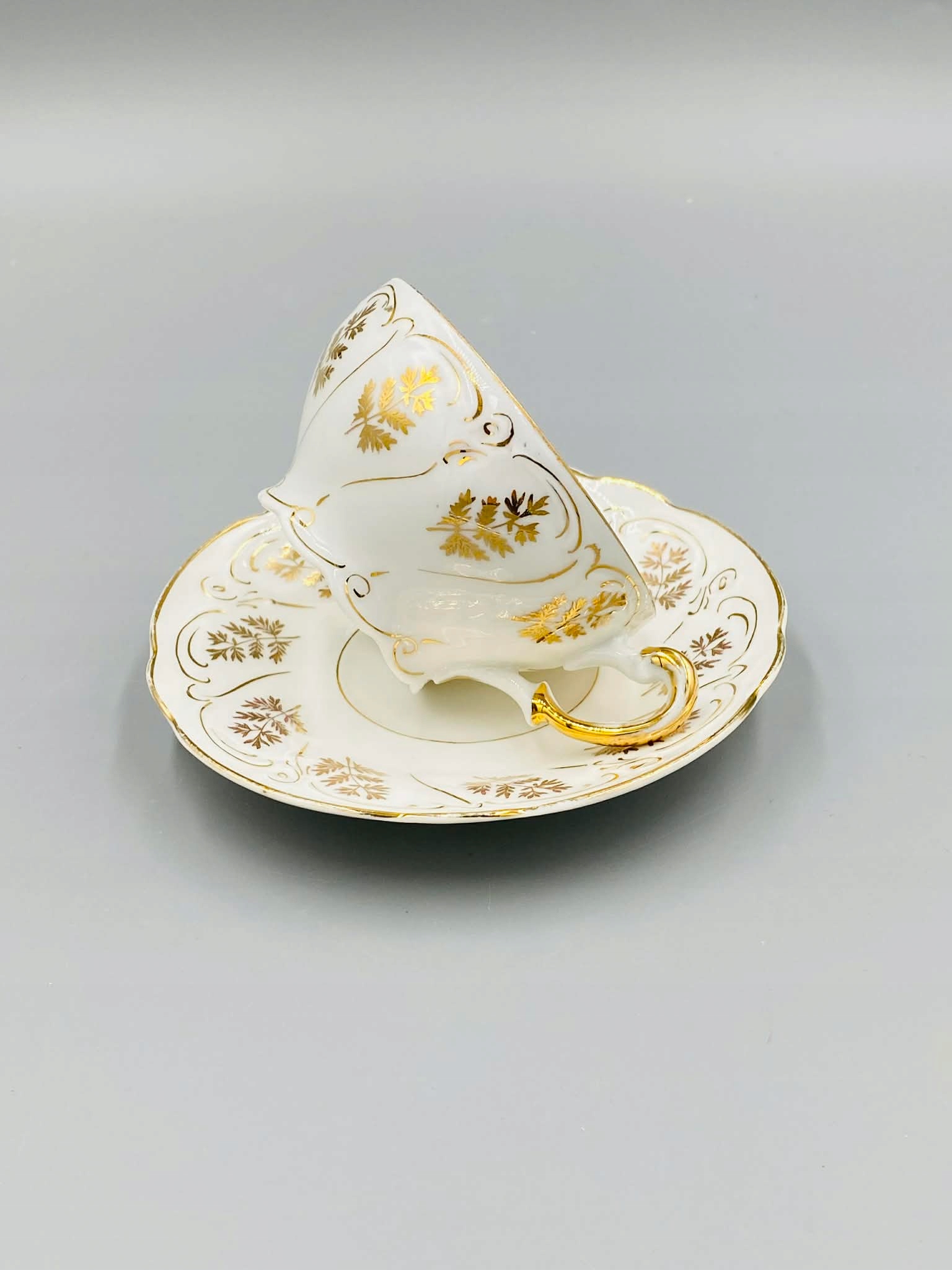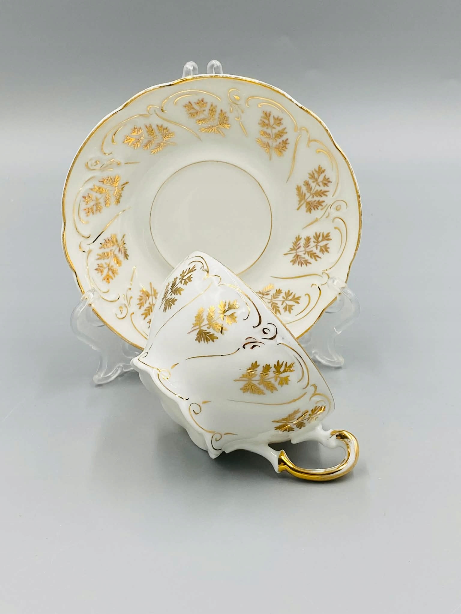 Біла порцеляна, прикрашена золотими рослинними мотивами. Пластикові кромки підставки. Позолочена вишукана ручка.
