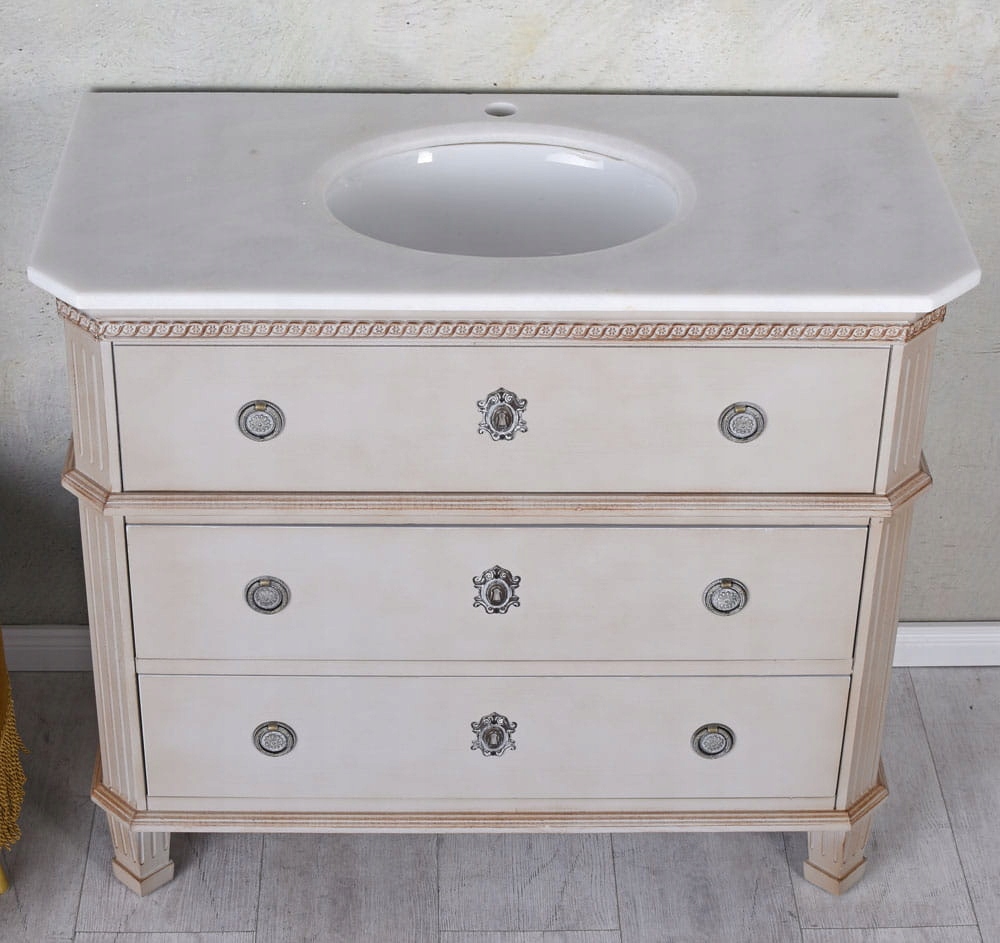 Стародавній керамічний умивальник з шафою шафи з ящиками. Мармуровий верх