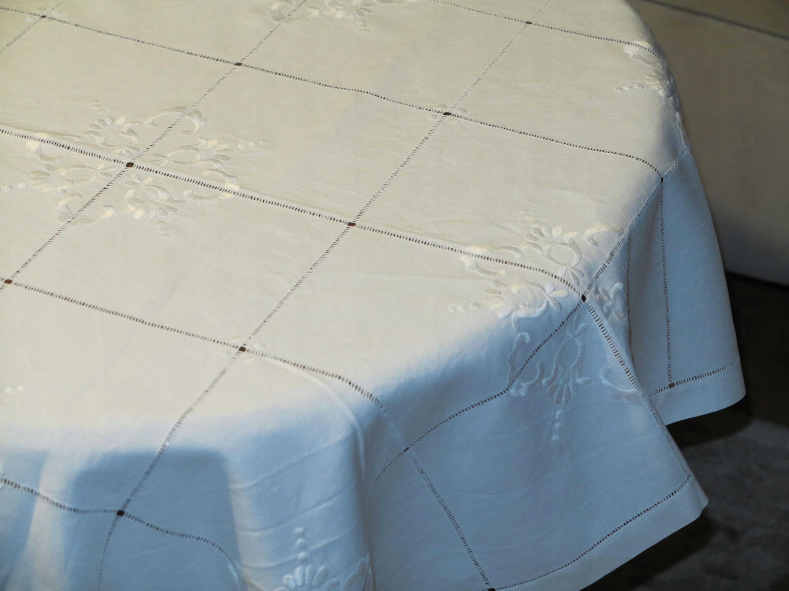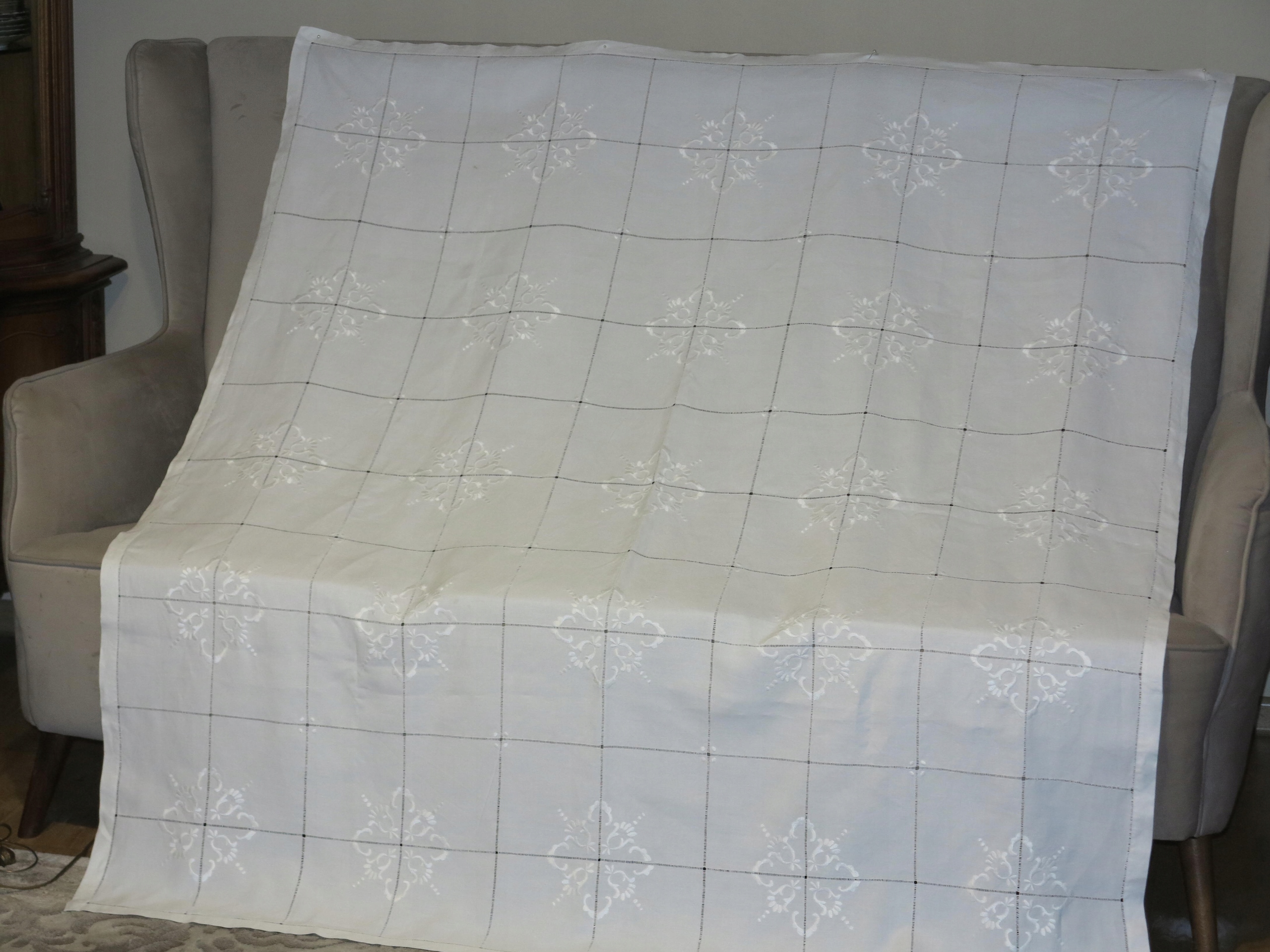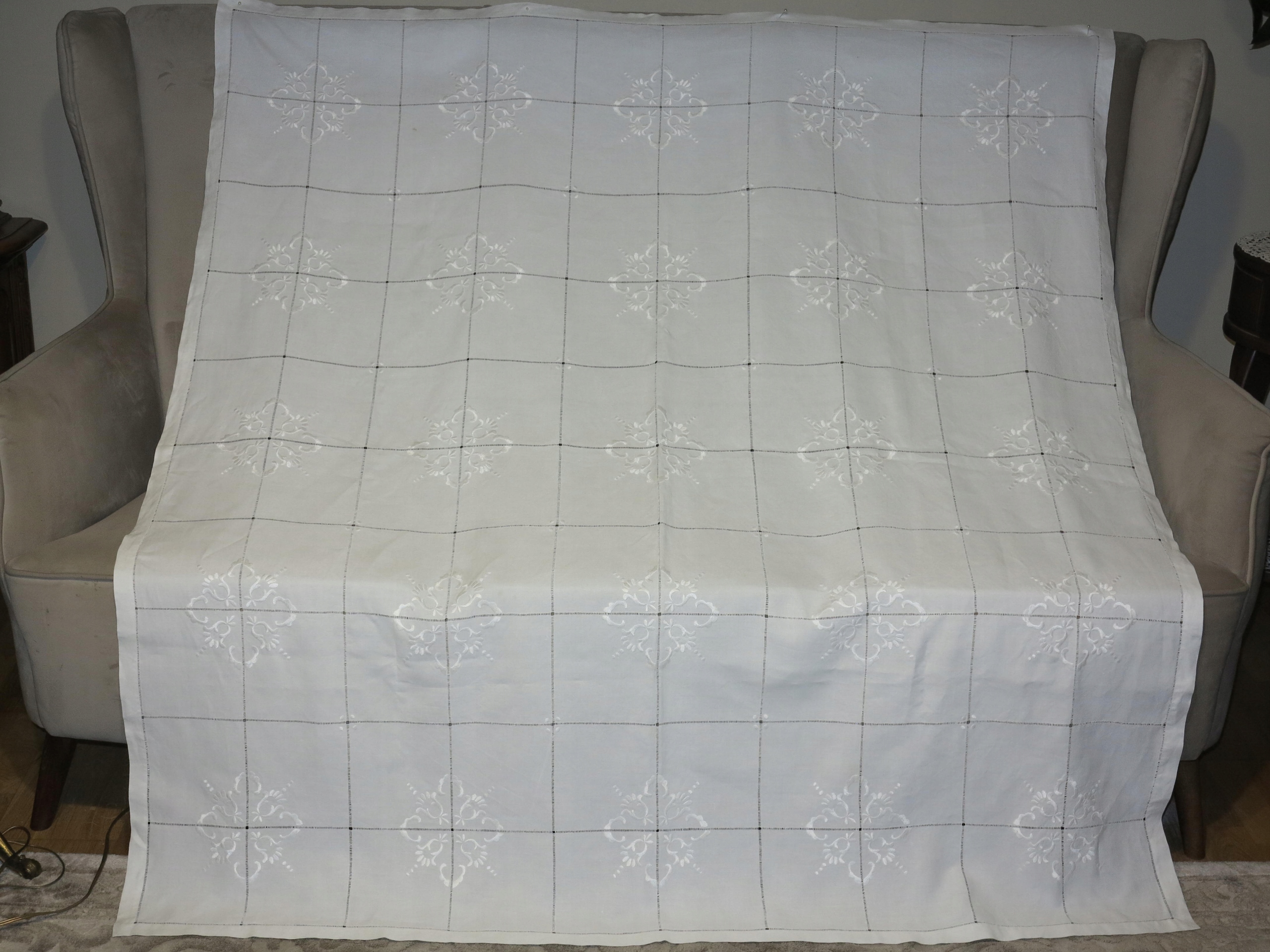 АНТИЧНУ - НАДЗВИЧАЙНУ ГАРНУ СКАТЕРТИНУ З БІЛОГО ЛЬОНУ 1900-Х СТОЛІТТЯ З ДУЖЕ БАГАТОЮ ПОВ'ЯЗКОЮ ТА ВИШИВКОЮ РУЧНОЇ РОБОТИ. ДУЖЕ складна, трудомістка ручна робота.