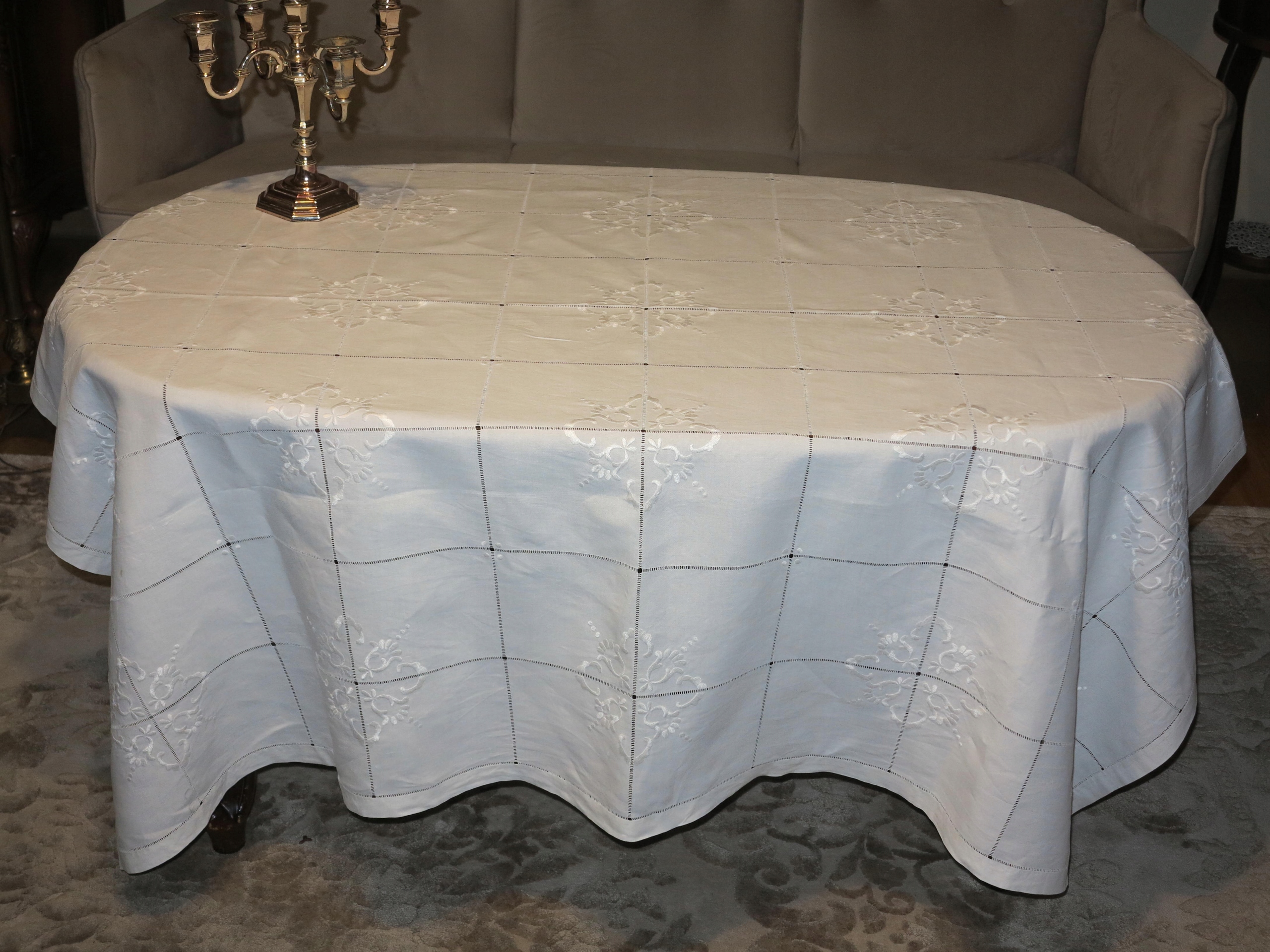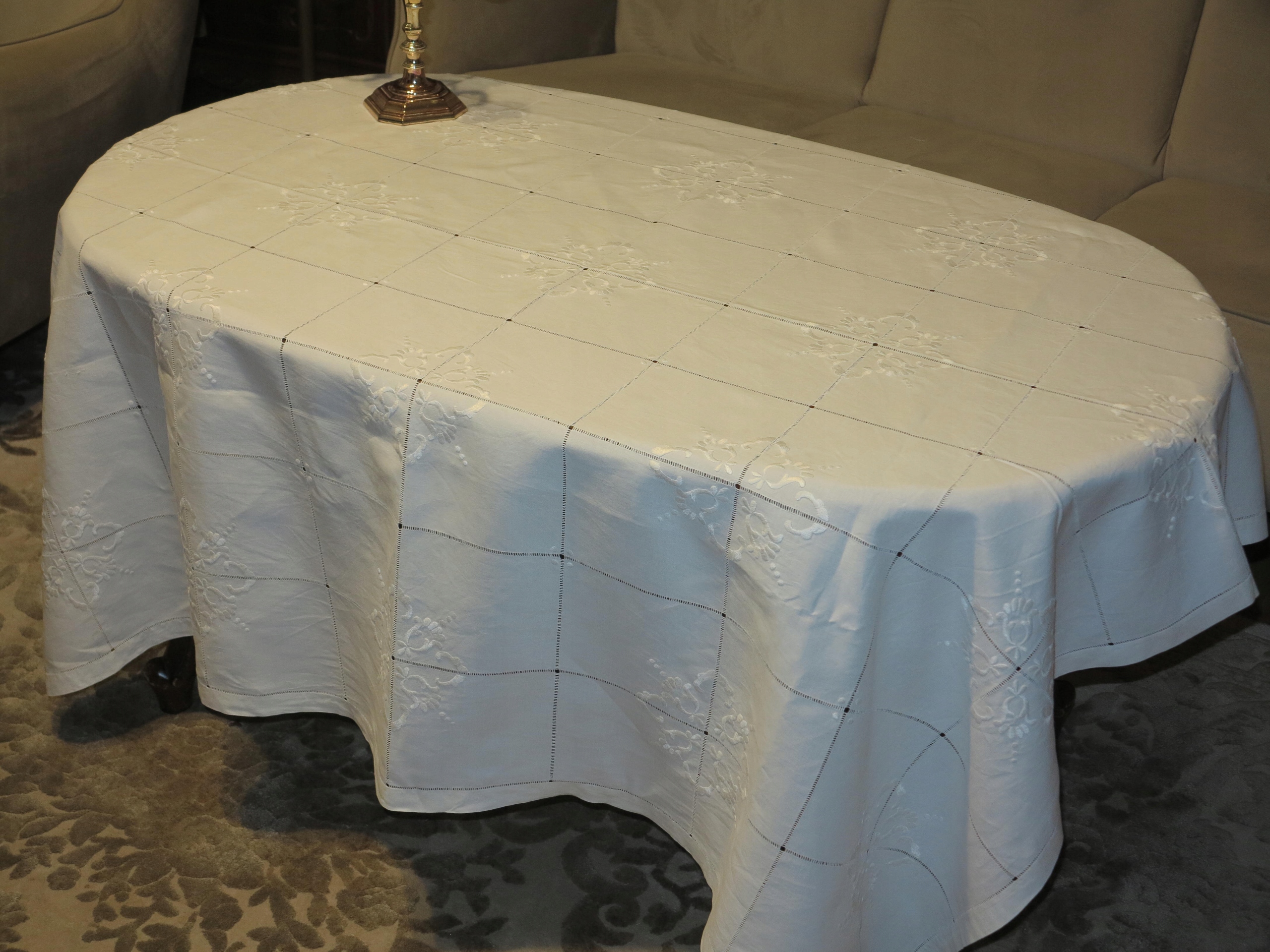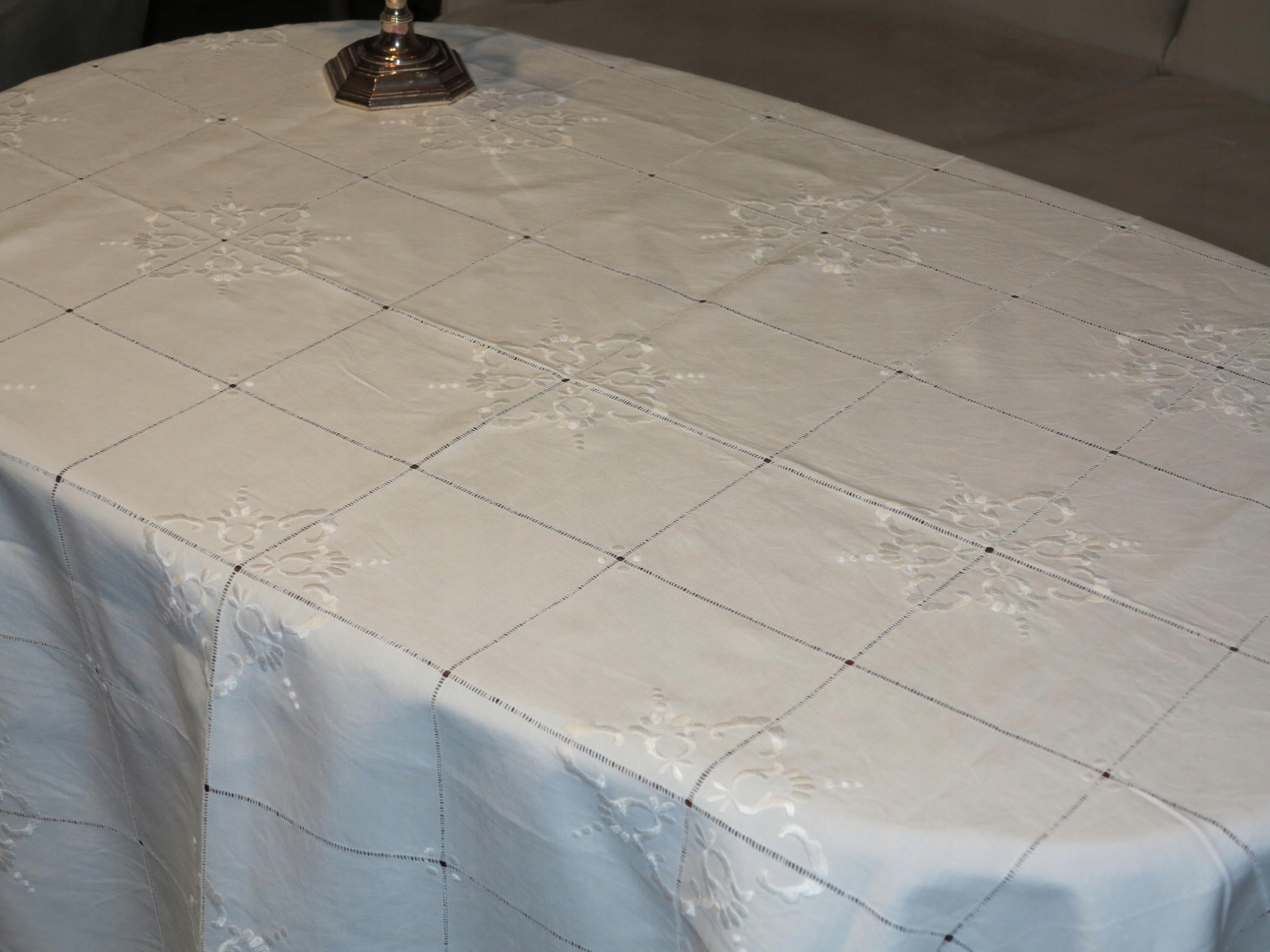 АНТИЧНУ - НАДЗВИЧАЙНУ ГАРНУ СКАТЕРТИНУ З БІЛОГО ЛЬОНУ 1900-Х СТОЛІТТЯ З ДУЖЕ БАГАТОЮ ПОВ'ЯЗКОЮ ТА ВИШИВКОЮ РУЧНОЇ РОБОТИ. ДУЖЕ складна, трудомістка ручна робота.