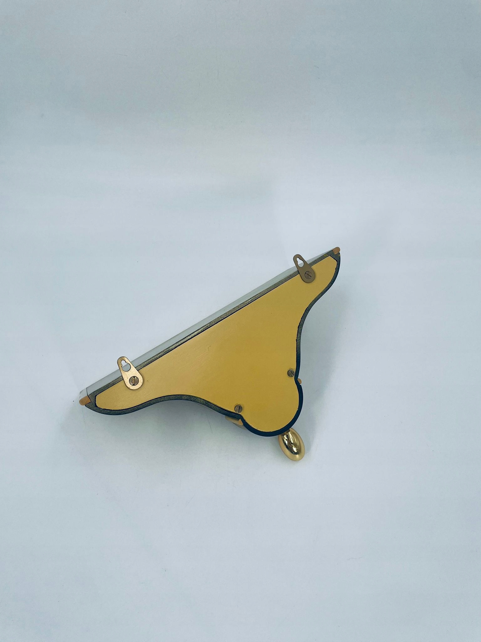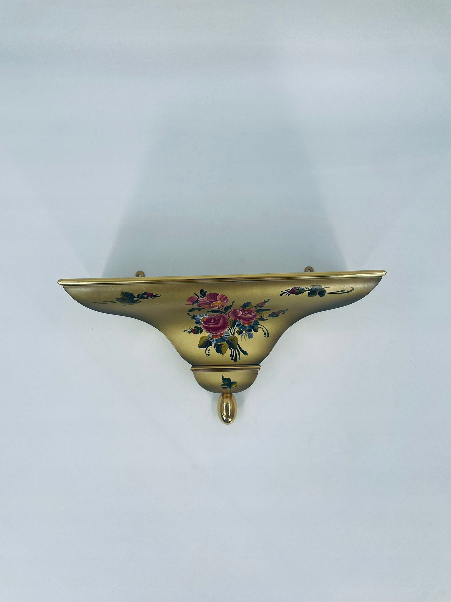 Настінна декоративна полиця під старовину, золотого кольору. Полиця має класичну різьблену форму із закругленими краями та декоративним свесом внизу. Він має квітковий мотив, розписаний вручну. Ці типи полиць були розроблені спеціально для демонстрації годинників. Є невелика подряпина