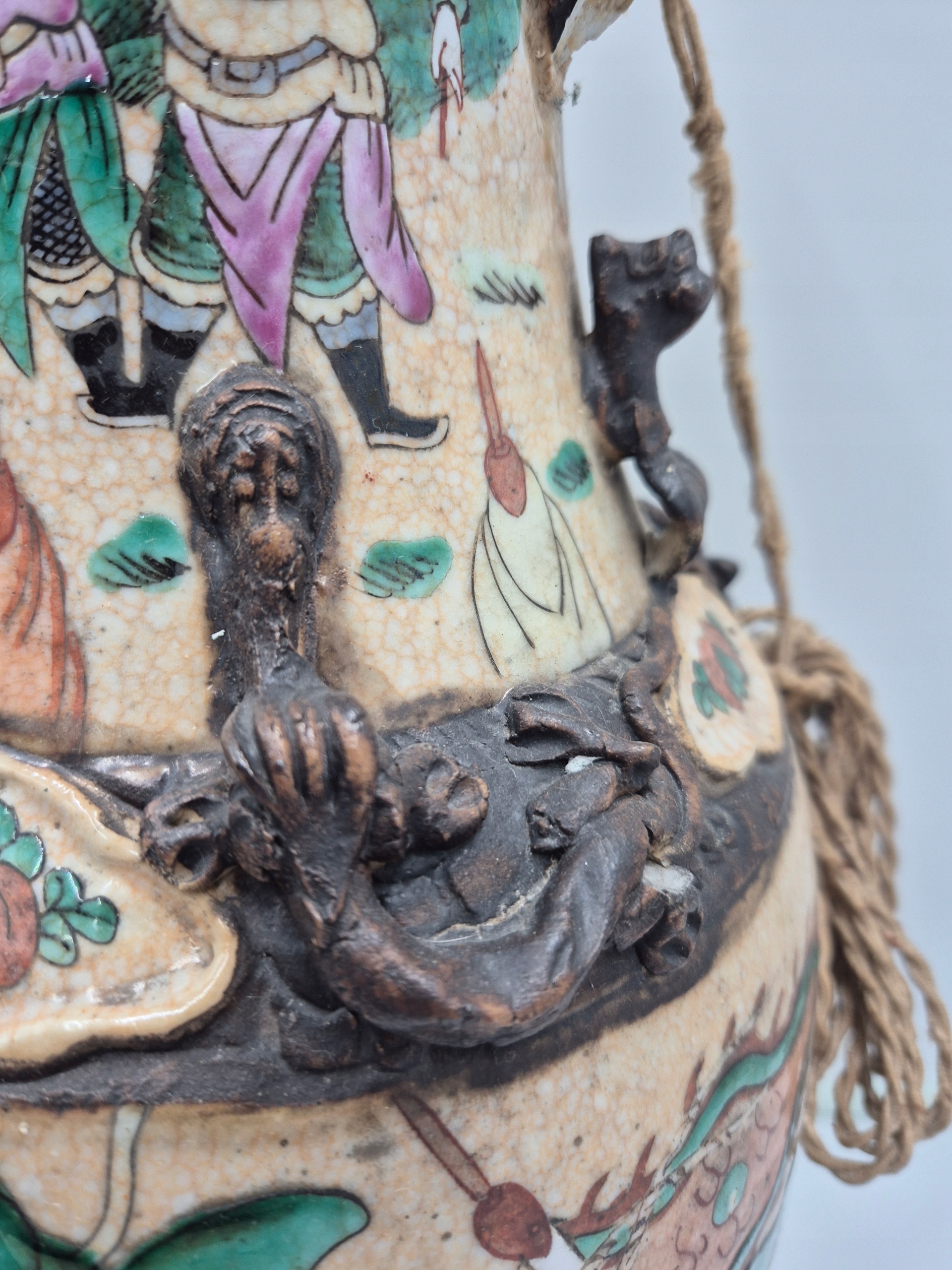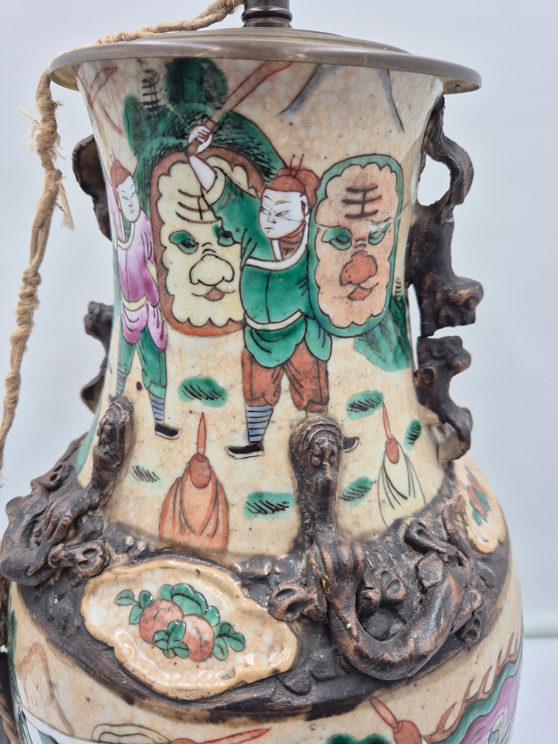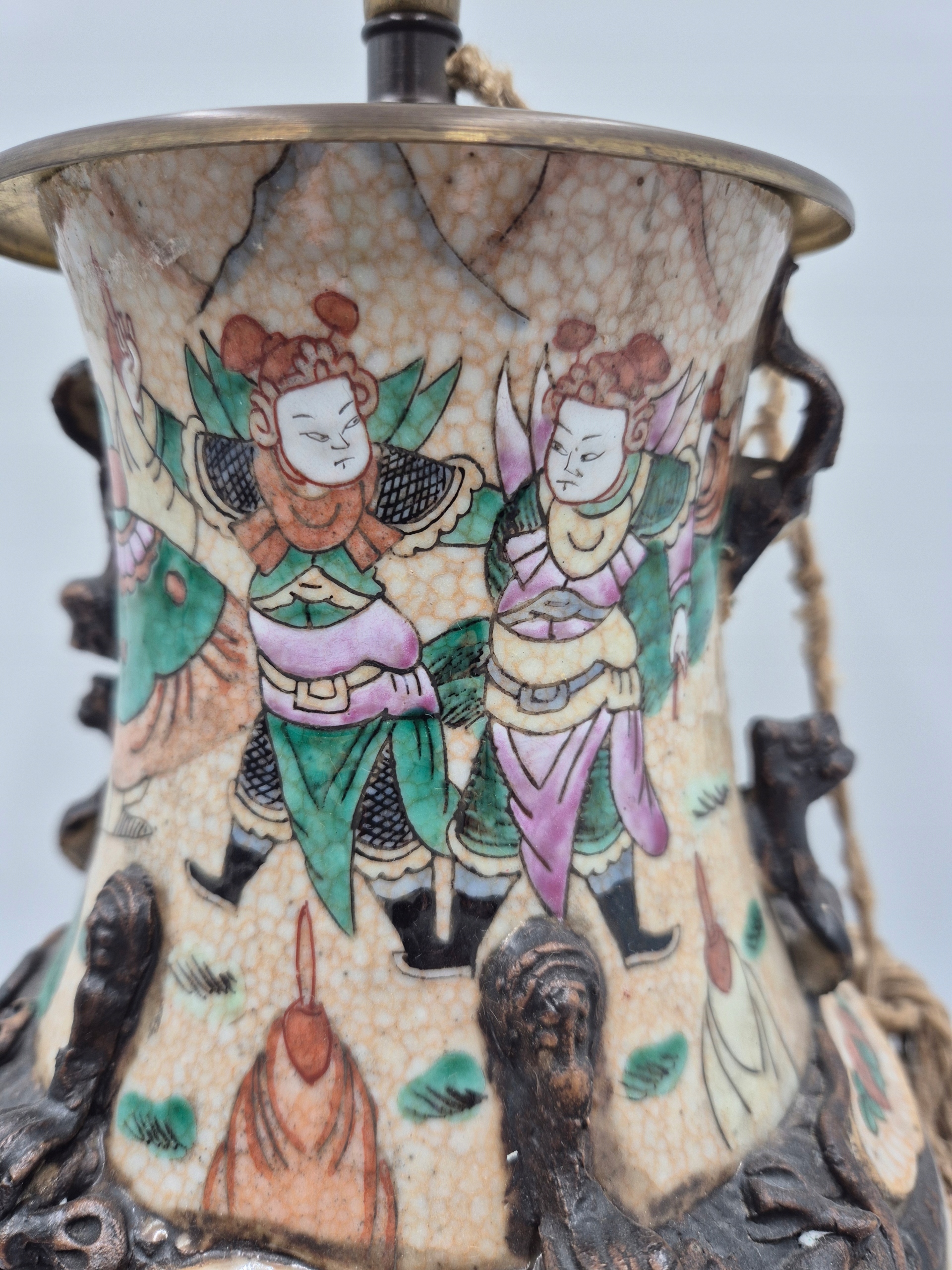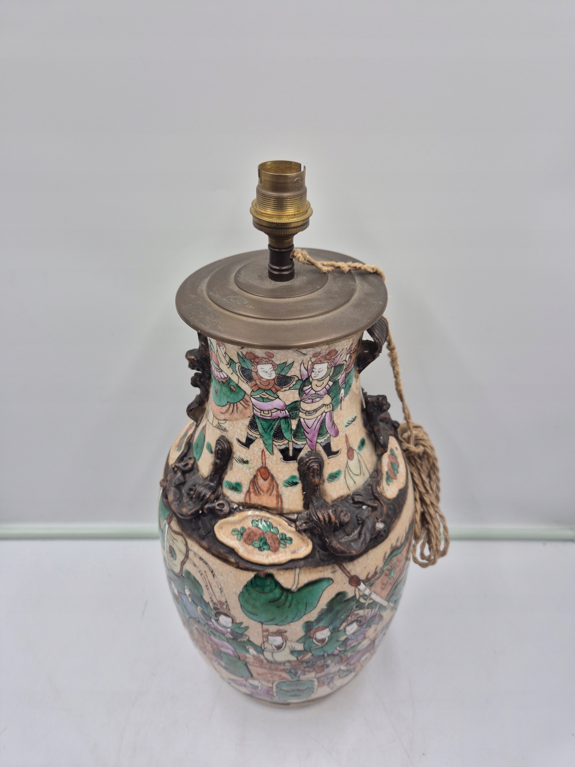Антична китайська нанкінська керамічна лампа. Тут ми маємо неймовірний антикваріат у формі китайської нанкінської вази, перетвореної на лампу. Ваза не просвердлена, кабель лампи виходить з верхньої частини світильника. Сама ваза виконана в традиційному стилі з декоративними собаками-фу та драконами на верхній частині та китайськими бойовими сценами навколо корпусу.