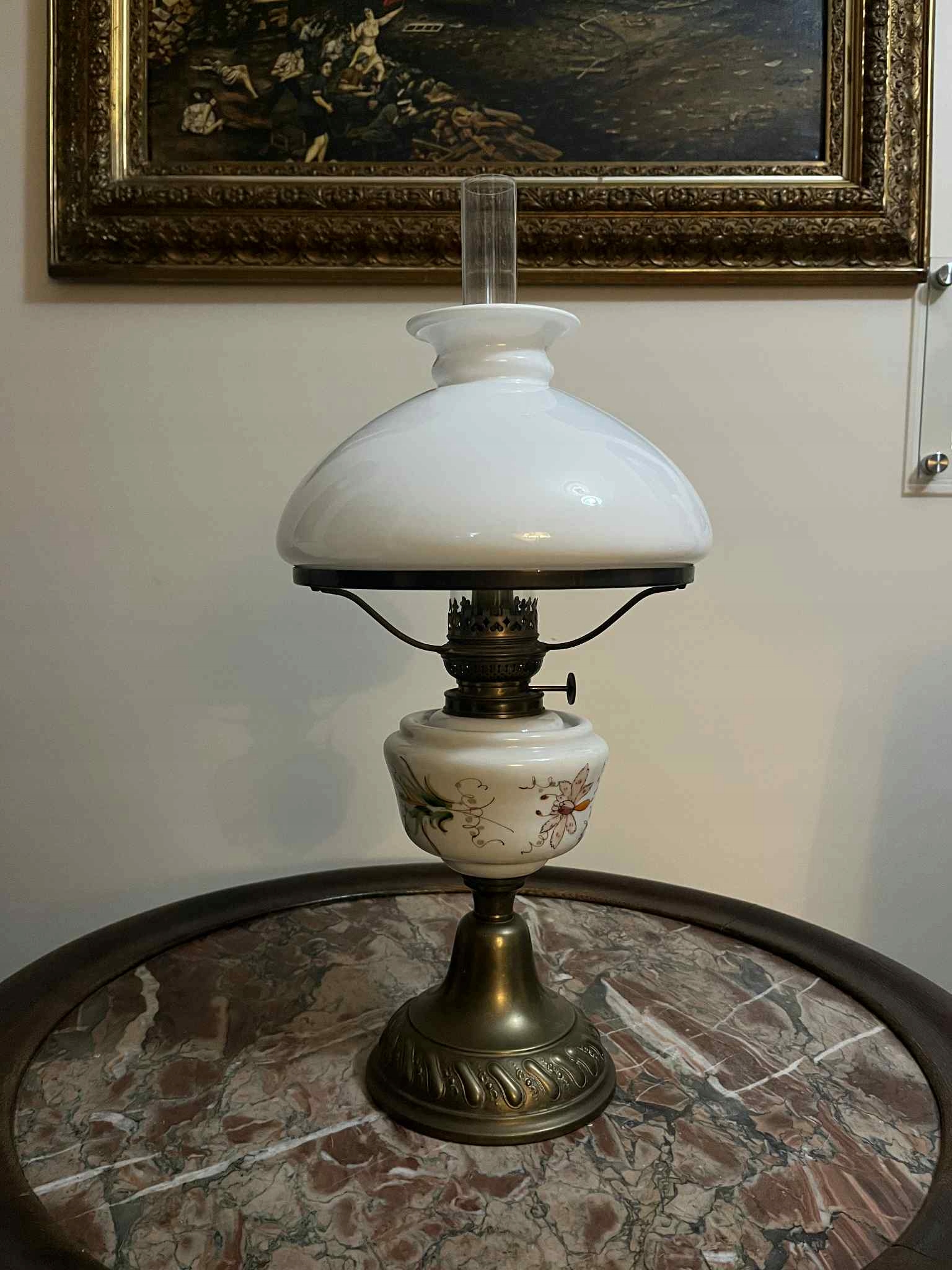 СВІТИЛЬНИК ВИГОТОВЛЕНО З ЛАТУНІ В ОСНІ ТА МОЛОЧНОГО СКЛА З РОЗПИСАНИМИ ВРУЧНУ КВІТКОВИМИ МОТИВАМИ.