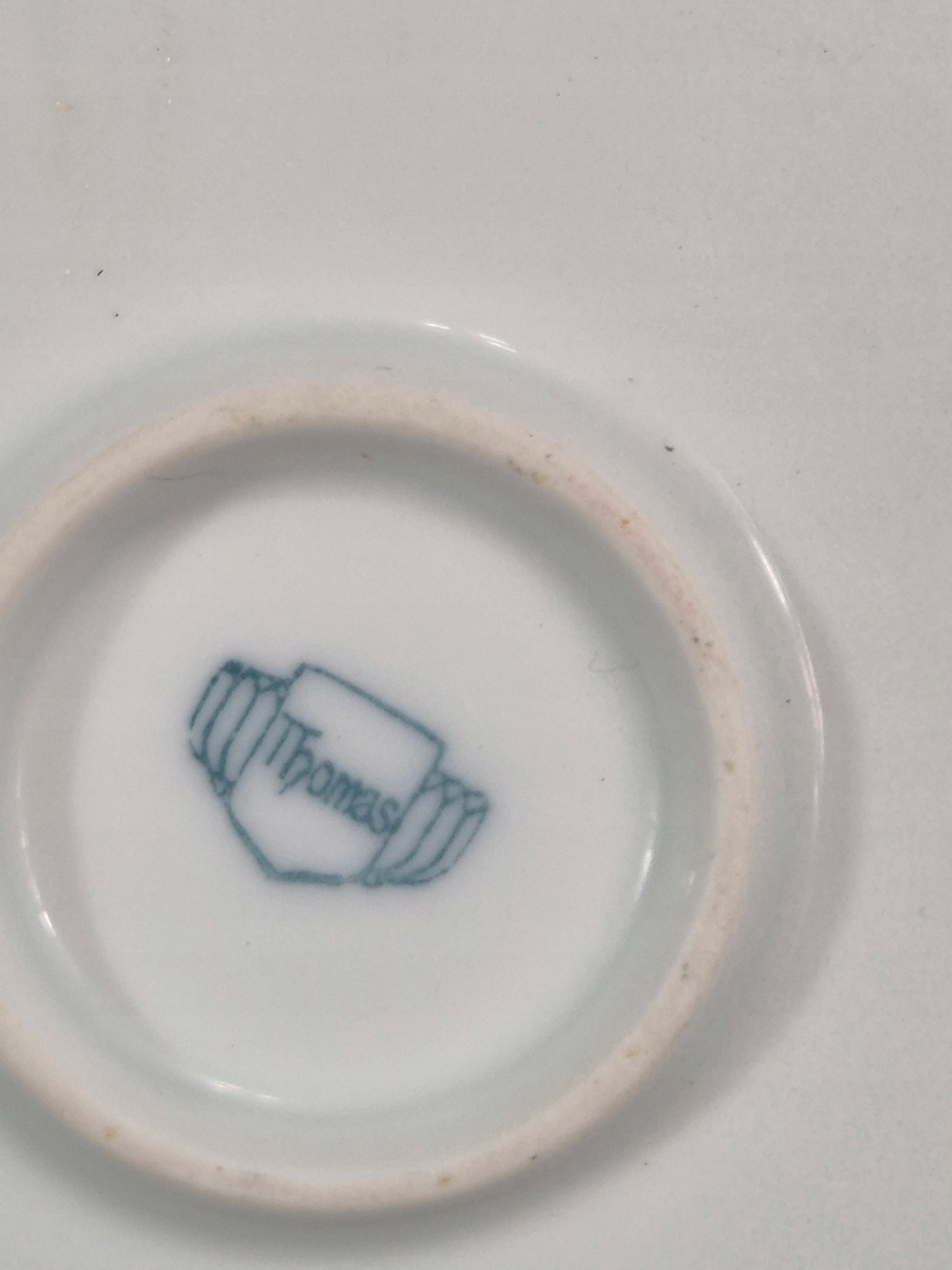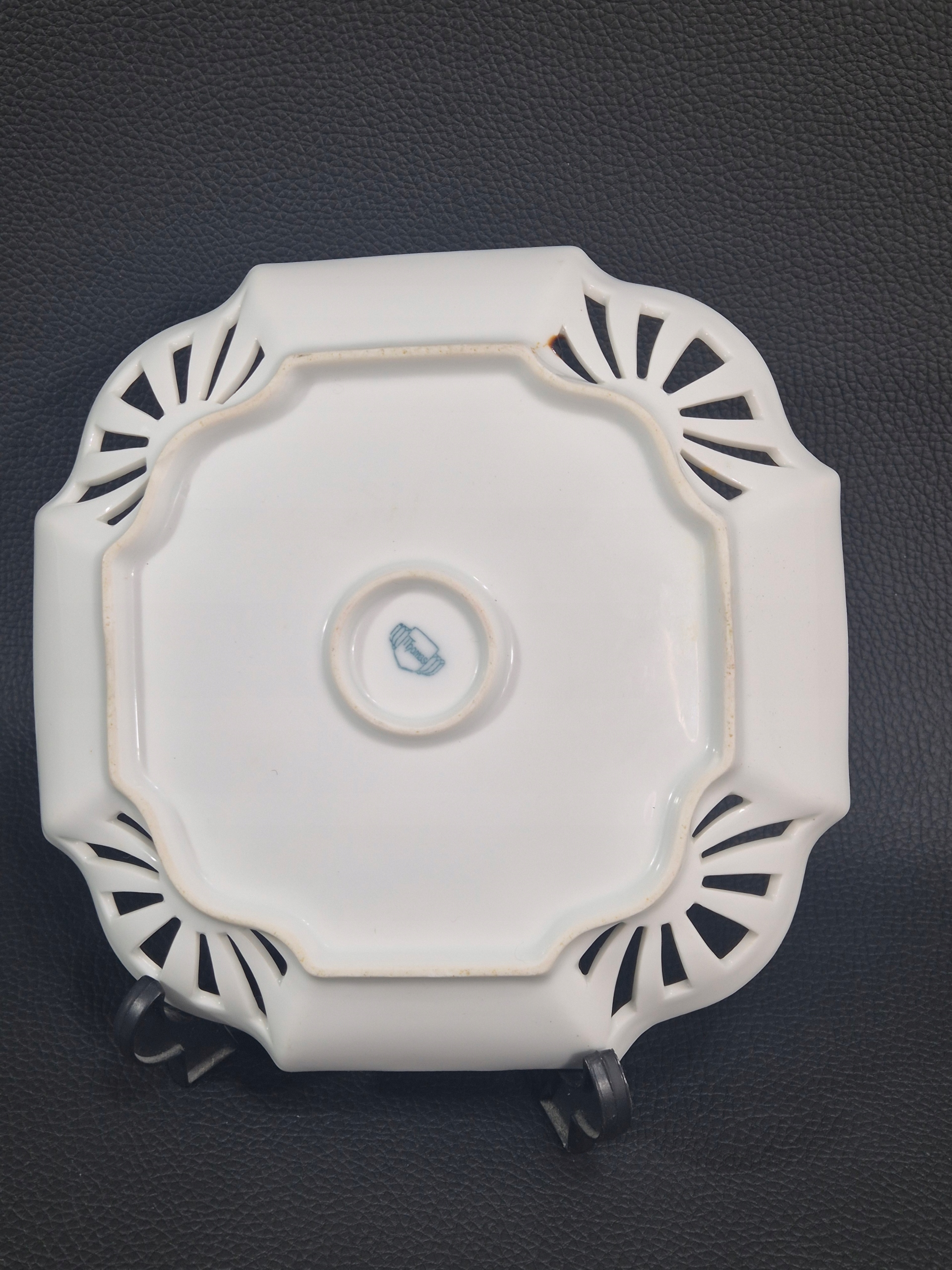 тарілка (декоративна тарілка) з ручками, вироблена німецькою порцеляновою компанією Thomas, яка є частиною групи Rosenthal з 1908 року. Предмет походить із періоду, коли ім’я «Томас Баварія» було включено в підпис, що означає, що воно, ймовірно, було виготовлено між 1908 і 1960 роками, коли виробництво на фабриці в Марктредвіці в Баварії закінчилося. Для цього візерунка характерні ажурні вирізи по краях, квіткові мотиви та золоті прикраси в стилі ар-деко або модерн початку середини століття.