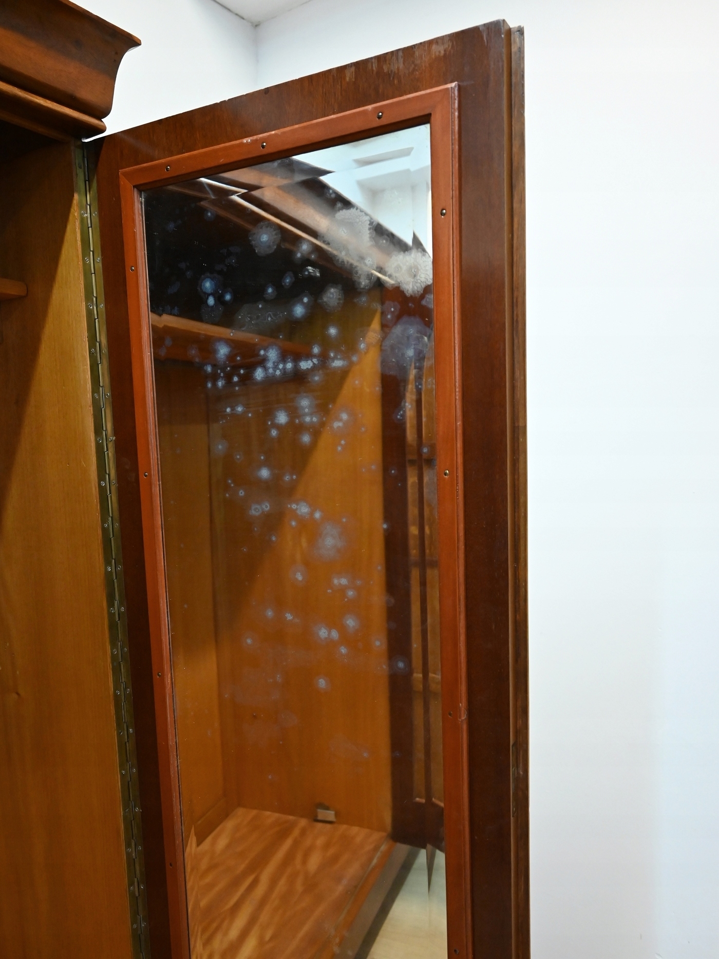 Дзеркало з видимими слідами минулих меблів, просочених підготовкою проти корових жуків. Немає активного кори жуть.