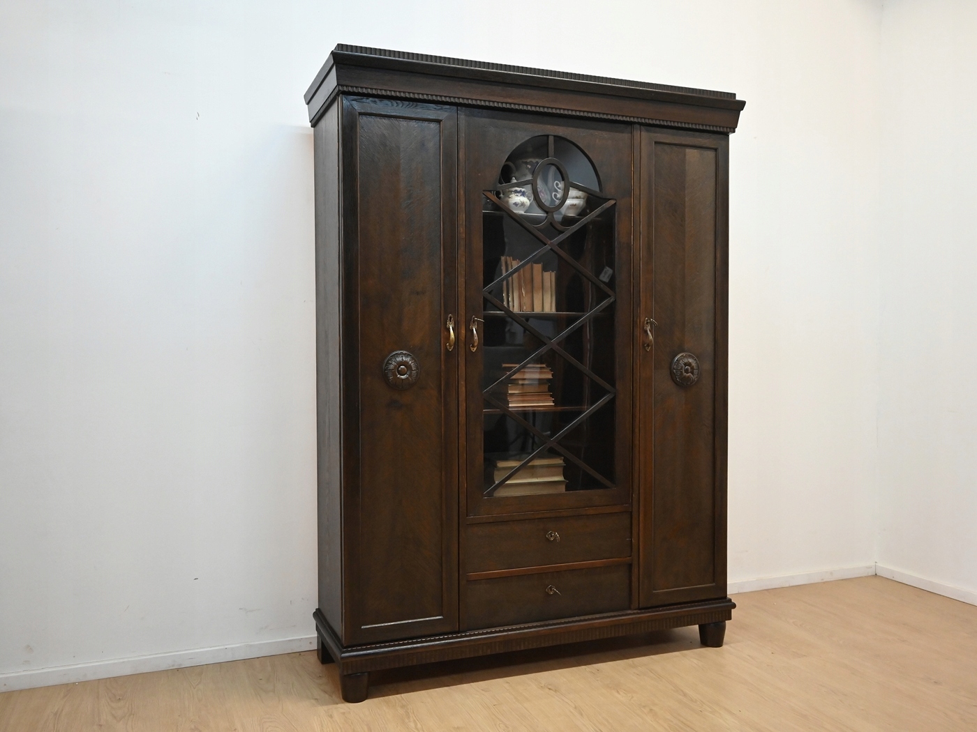 Дуже хороший стан. Меблі готові до використання. Оновлено зовнішні поверхні та інтер’єр меблів. Меблі вже старі, а сліди минулого, які не впливають на їх естетичне сприйняття, є доказом автентичності меблів. Бібліотека може бути заселена в квартиру відразу.