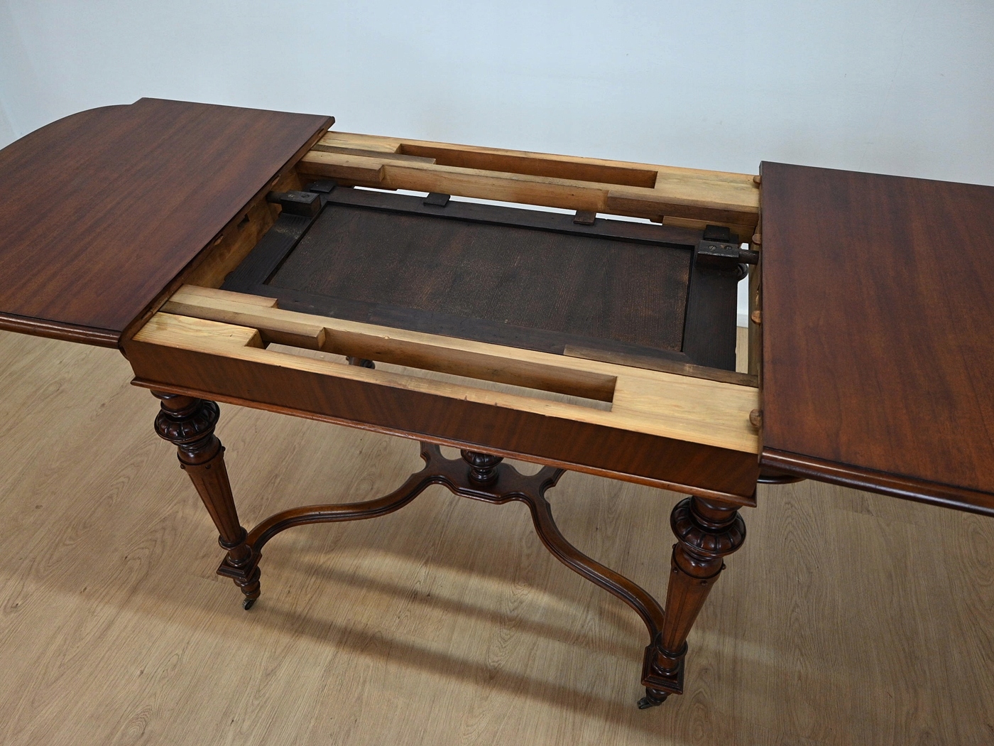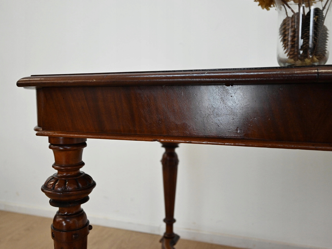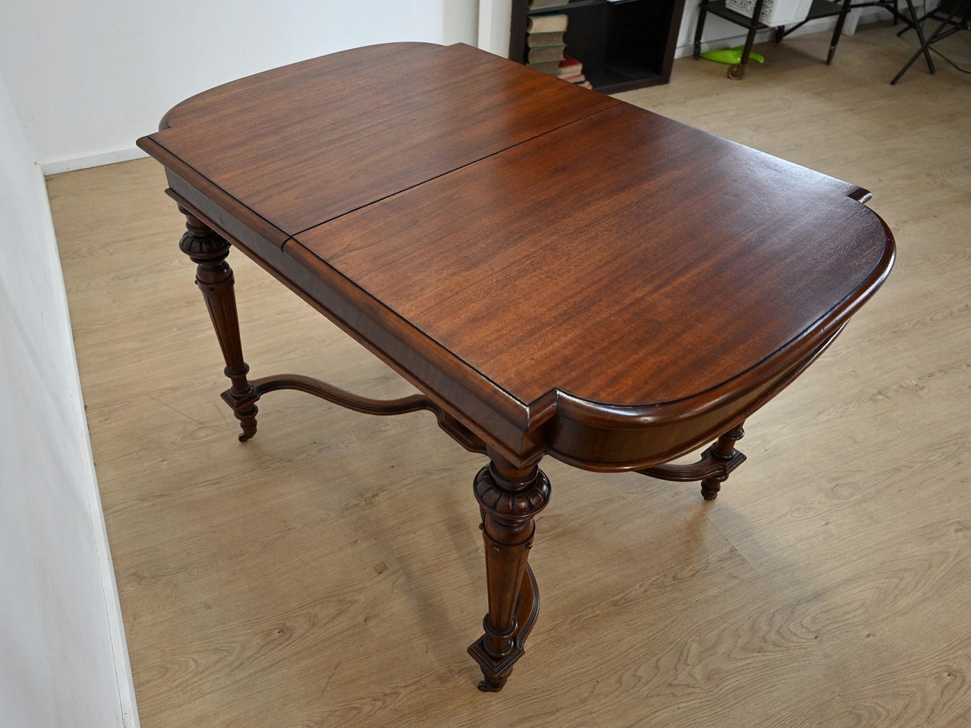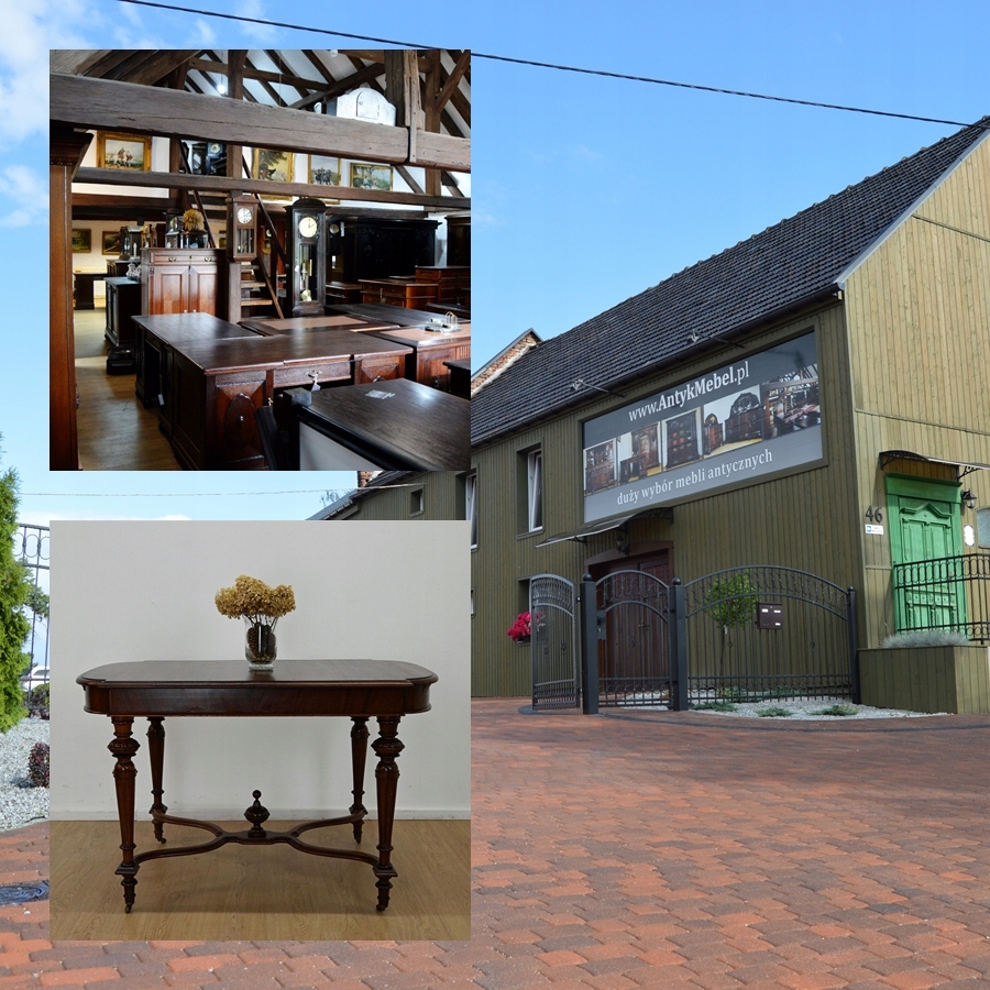 повністю виготовляються з дерева, шпонованого з Махоном. Меблі, підготовлені до використання. Зовнішні поверхні та центр меблів були оновлені. Меблі вже мають свої роки та сліди минулого часу, що не впливає на його естетичний прийом, вони є свідченням справжності меблів. Стіл можна негайно поставити в квартиру.