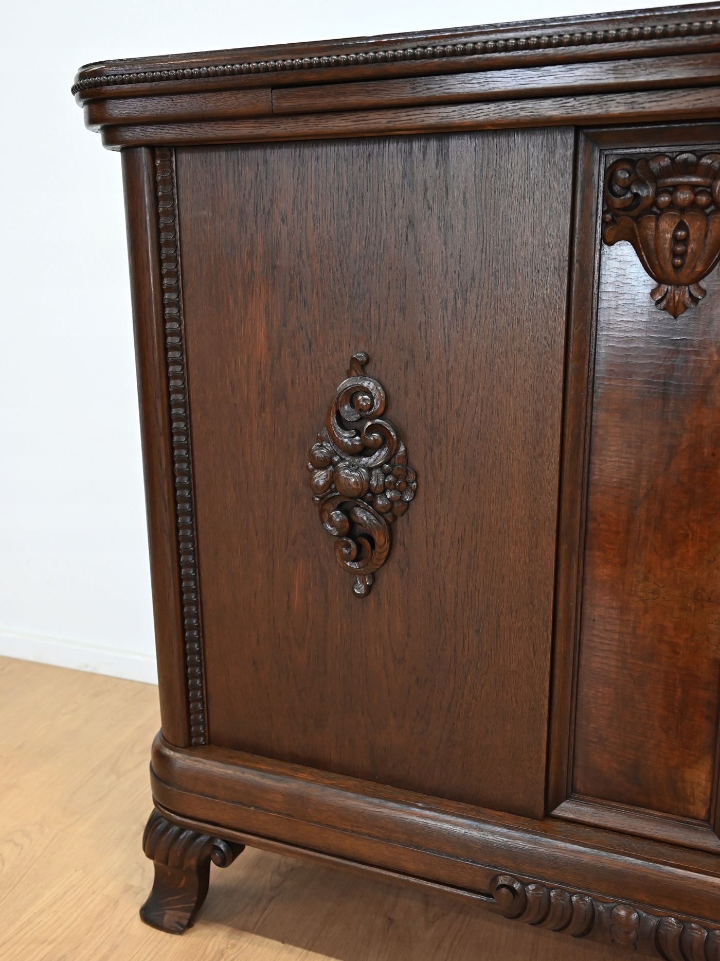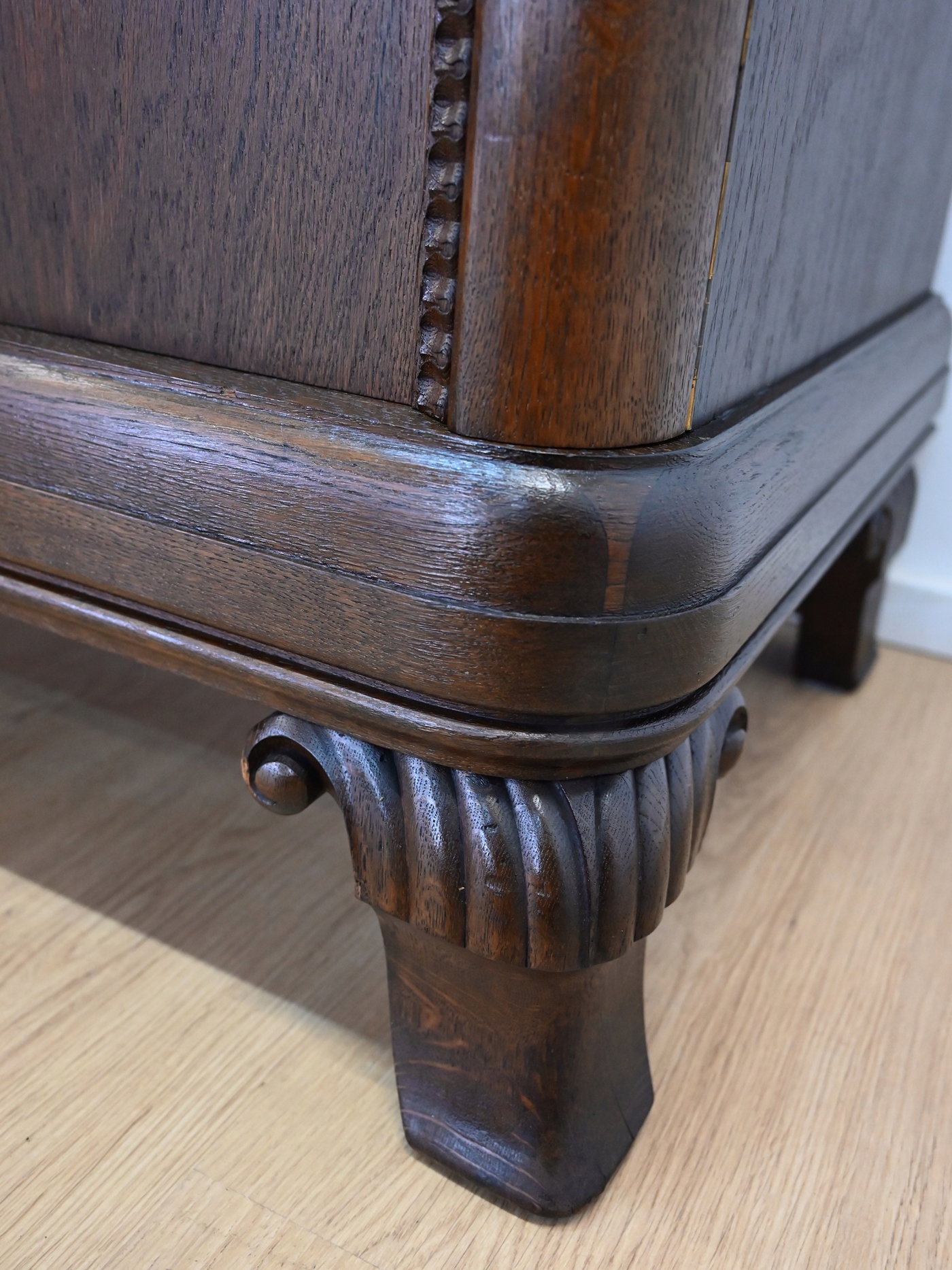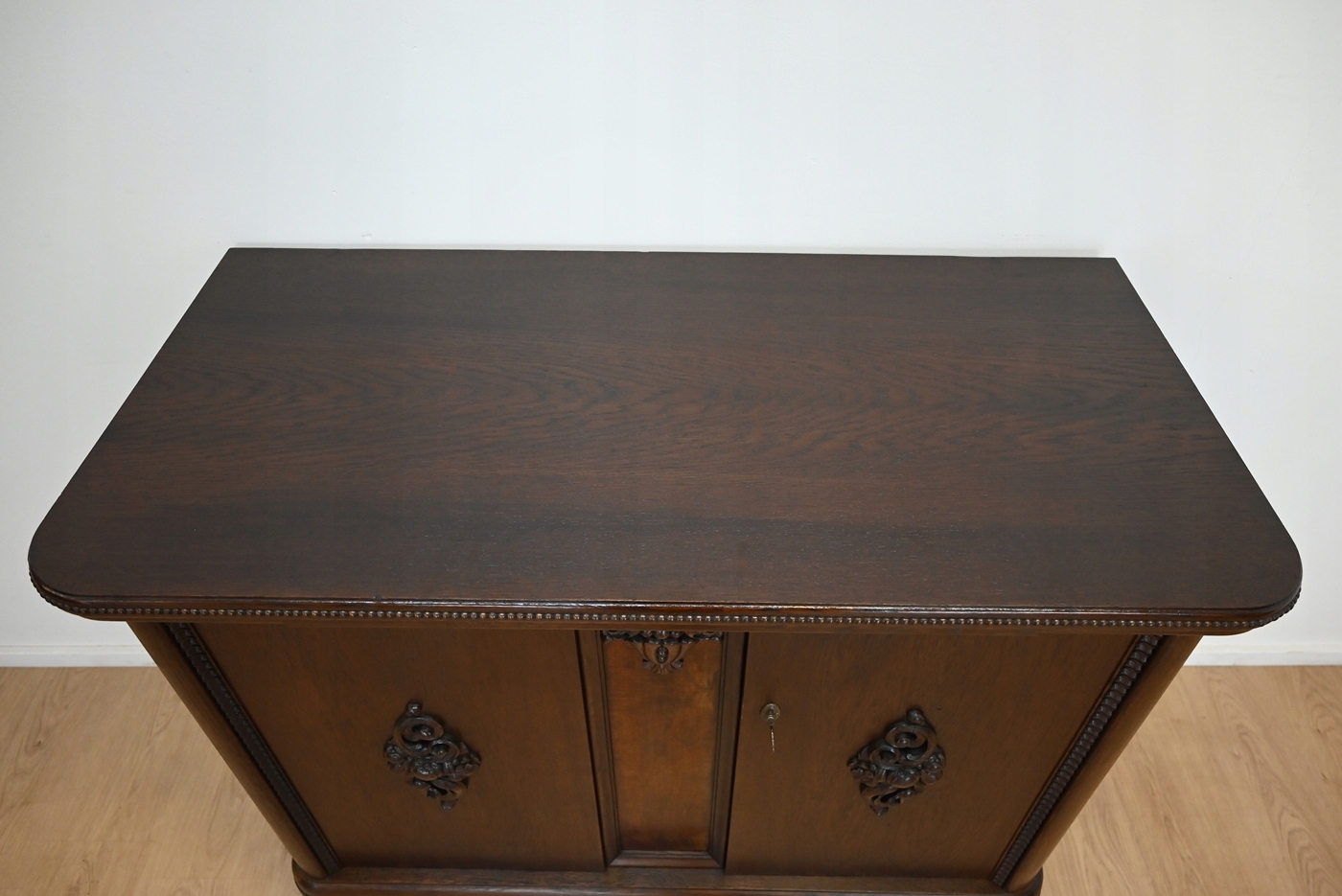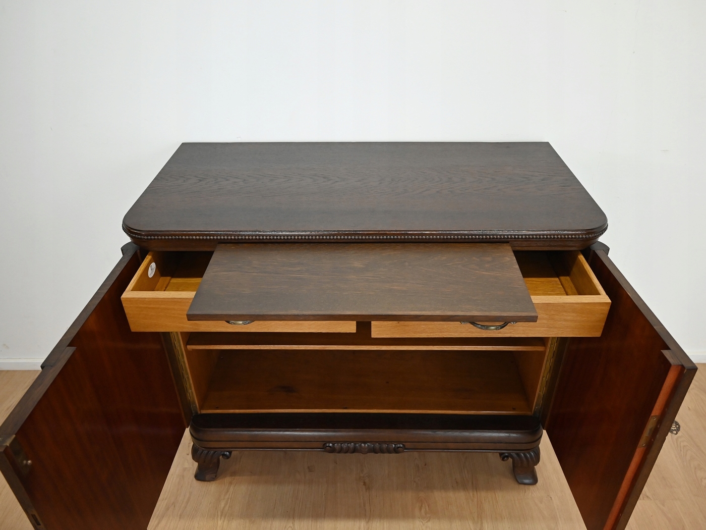 Дуже хороший стан. Меблі, підготовлені до використання. Зовнішні поверхні та центр меблів були оновлені. Меблі вже мають свої роки та сліди минулого часу, що не впливає на його естетичний прийом, вони є свідченням справжності меблів. Брудену скриню можна негайно поставити в квартиру.